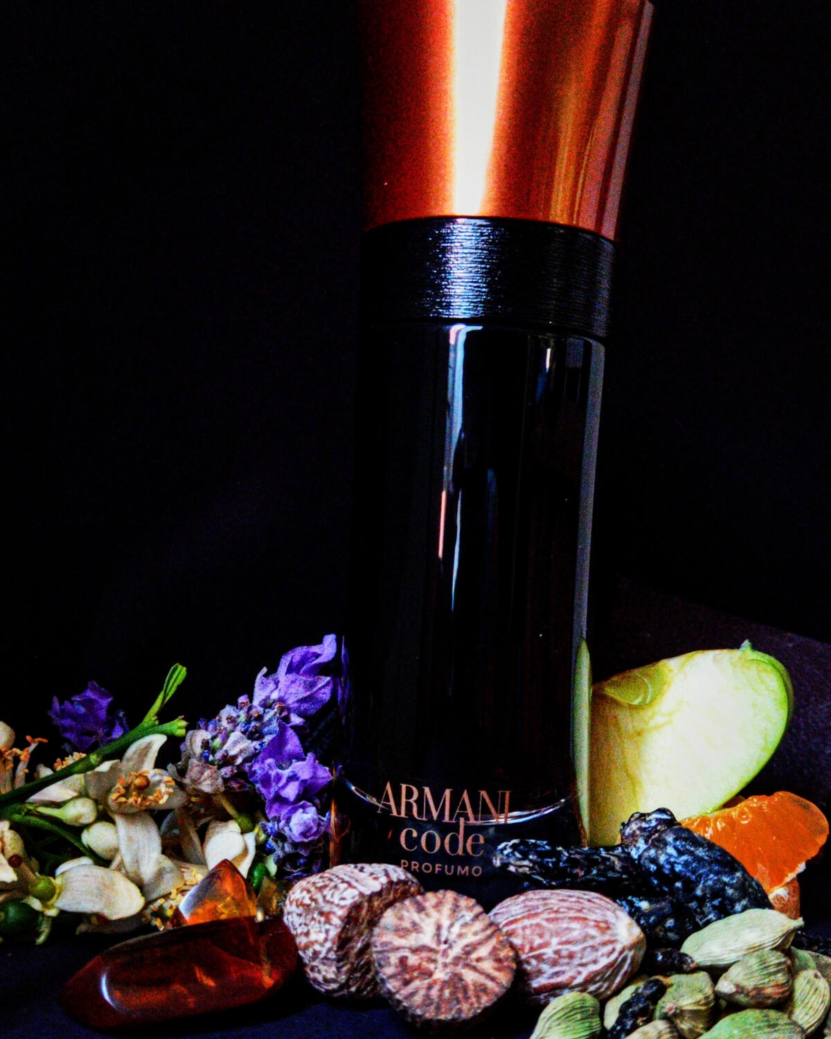Giorgio Armani Code Profumo se otevírá silnou projekcí sladkých, kožených, kořeněných a ovocných tónů. Úvod je velmi výrazný, aromatický a příjemný. Kožený akord je velmi výrazný, působí jako suchá bílá kůže a má jemnou benzínovou atmosféru, ale není štiplavý ani živočišný. Tonka, která je uvedena jako základní nóta, ale objeví se hned po nanesení vůně, dodává sladký, karamelový nádech. Zelená mandarinka a zelené jablko kombinují své tóny a dodávají ovocný nádech, méně výrazné jsou levandule a pomerančový květ, oba květinové akordy. Kardamom a muškátový oříšek vytvářejí kořeněný tón, který se dobře snoubí s kůží, není výrazný, ale je patrný. Nakonec jantar dodává pryskyřičný, sladký a vystupující akord. Vůně má tři výrazné vystupující akordy, tonku, jantar a kůži. Nejvýraznější změnou od úvodu k zaschnutí jsou ovocné tóny, které jsou patrné během úvodu, ale směrem k zaschnutí se výrazně rozptylují. Jakmile Giorgio Armani Code Profumo dosáhne úplného zaschnutí, lze ji shrnout jako silně vystupující, sladkou (tonka), koženou, kořeněnou (kardamon, muškátový oříšek) vůni s jemnými citrusovými a květinovými akordy. Vůně působí odvážně, ležérně, exoticky, těžce, kvalitně, impozantně, intenzivně, koženě, mužně, moderně, nočně, hravě, kořeněně, sladce aromaticky, hřejivě, všestranně a příjemně.