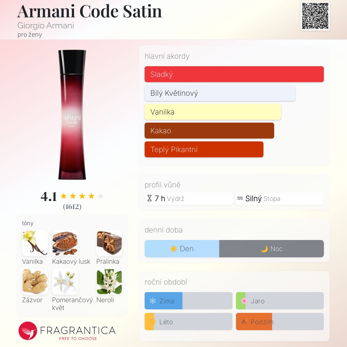 Armani Code Satin podle Giorgio Armani je Floral Fruity Gourmand vůně pro ženy. Armani Code Satin byl/a uveden/a v roce 2015. Vrchní tóny jsou Zázvor, Sorbet a Hruška; střední tóny jsouPomerančový květ, Neroli a Jasmín ; základní tóny jsou Vanilka, Kakao, Pralinka a Pačuli.