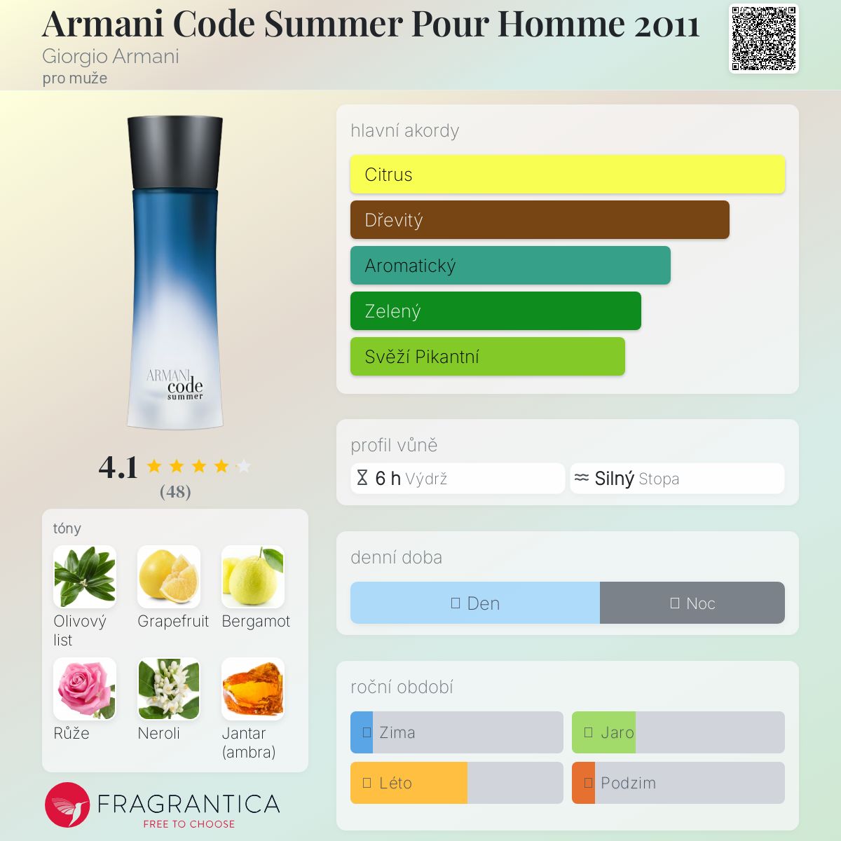 Armani Code Summer Pour Homme 2011 podle Giorgio Armani je Woody Aromatic vůně pro muže. Armani Code Summer Pour Homme 2011 byl/a uveden/a v roce 2011. Vrchní tóny jsou Grapefruit, Bergamot, Neroli a Mořská voda; střední tóny jsouOlivový list, Růže, Estragon a Virginský cedr ; základní tóny jsou Jantar (ambra), Pižmo, Guajakové dřevo a Dubový mech.