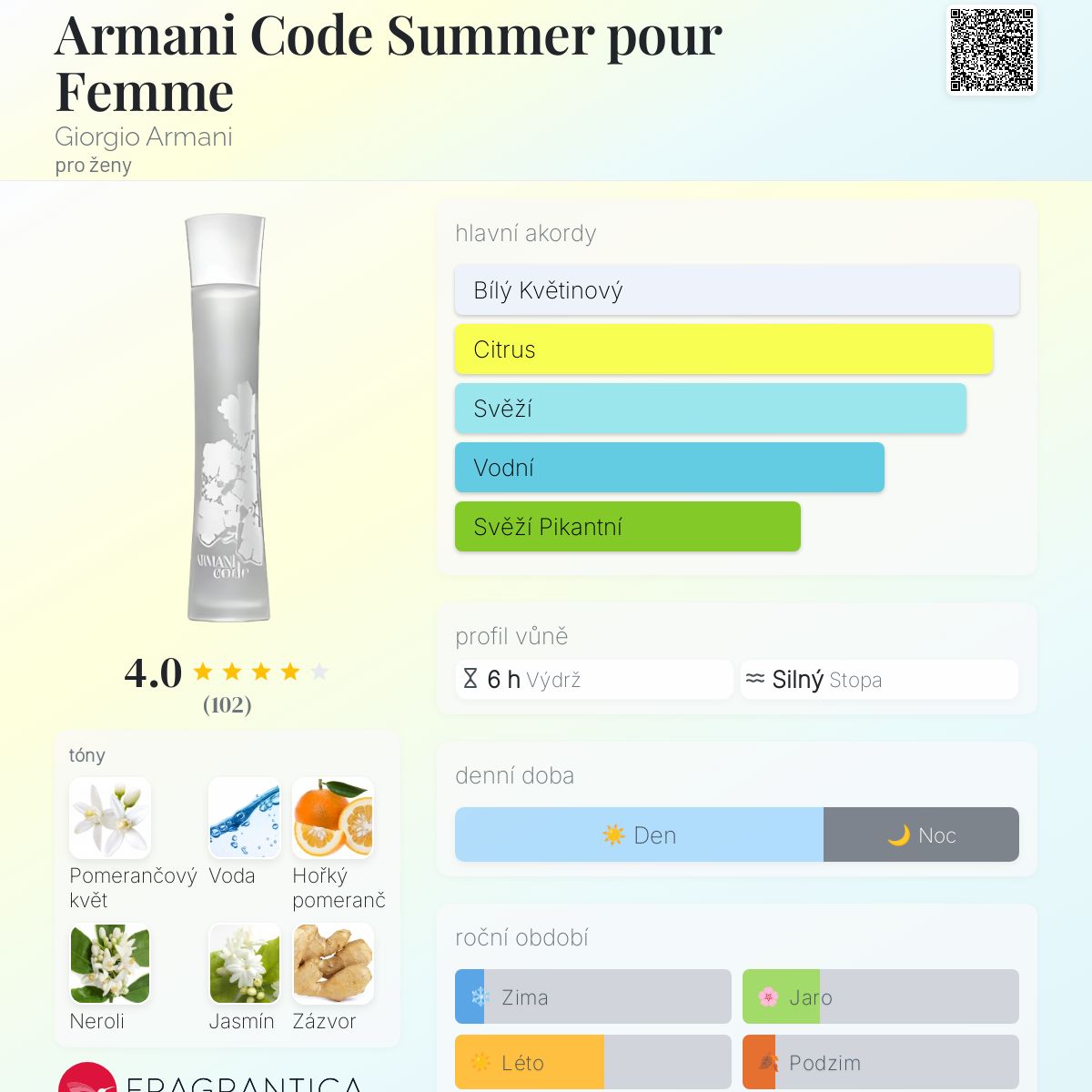 Armani Code Summer pour Femme podle Giorgio Armani je Floral Woody Musk vůně pro ženy. Armani Code Summer pour Femme byl/a uveden/a v roce 2009. Vrchní tóny jsou Vodní tóny, Hořký pomeranč, Neroli a Hruška; střední tóny jsouKvět afrického pomeranče, Jasmín, Zázvor a Brambořík ; základní tóny jsou Pižmo, Dřevité tóny a Vanilka.