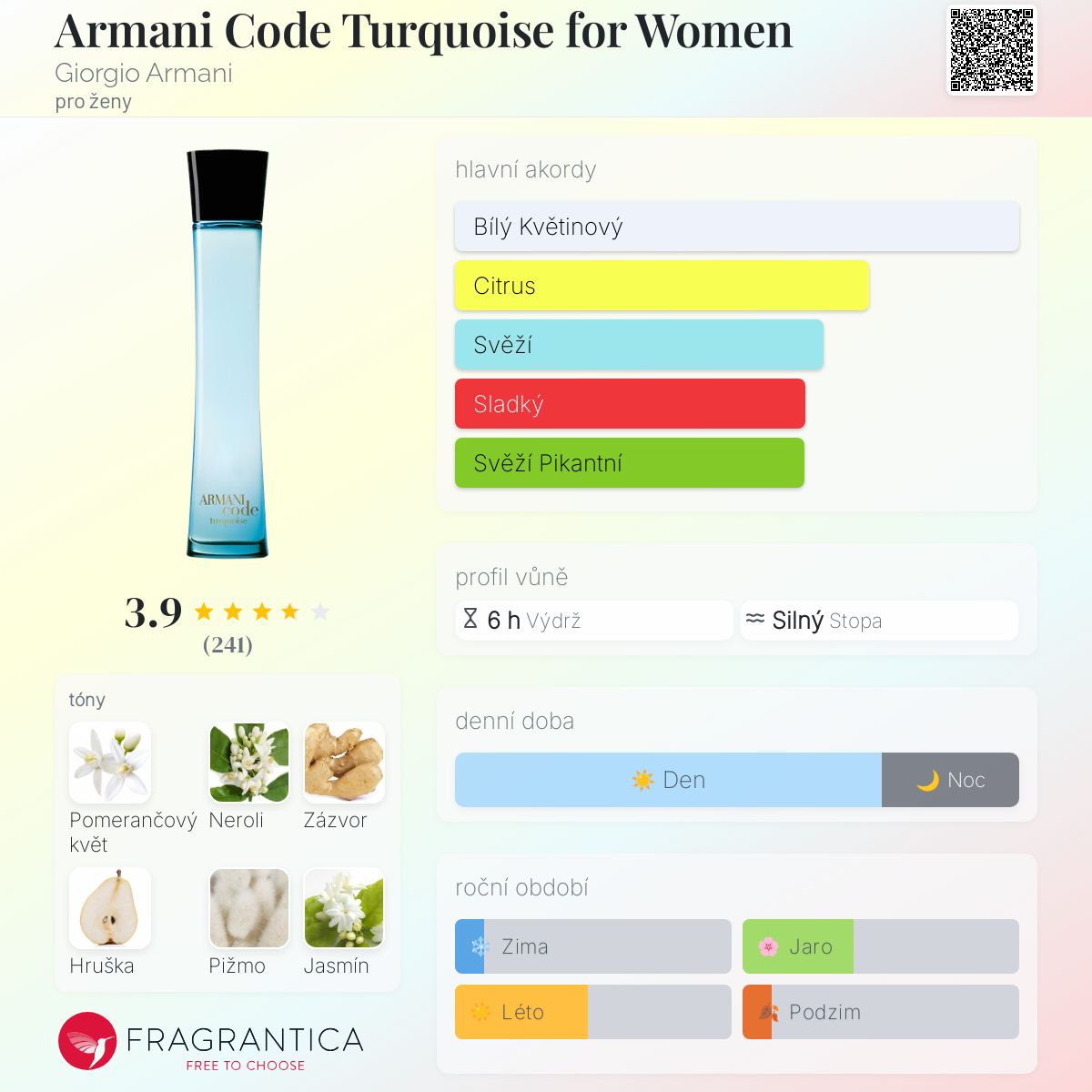 Armani Code Turquoise for Women podle Giorgio Armani je Floral vůně pro ženy. Armani Code Turquoise for Women byl/a uveden/a v roce 2015. Vrchní tóny jsou Pomerančový květ, Neroli a Hruška; střední tóny jsouPomerančový květ, Zázvor a Jasmín ; základní tóny jsou Pomerančový květ, Pižmo, Bílé dřevo a Vanilka.