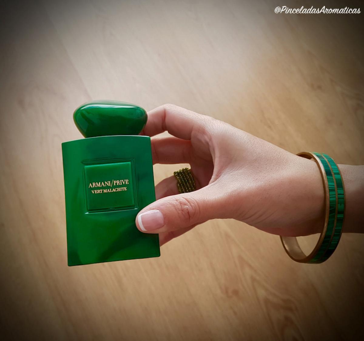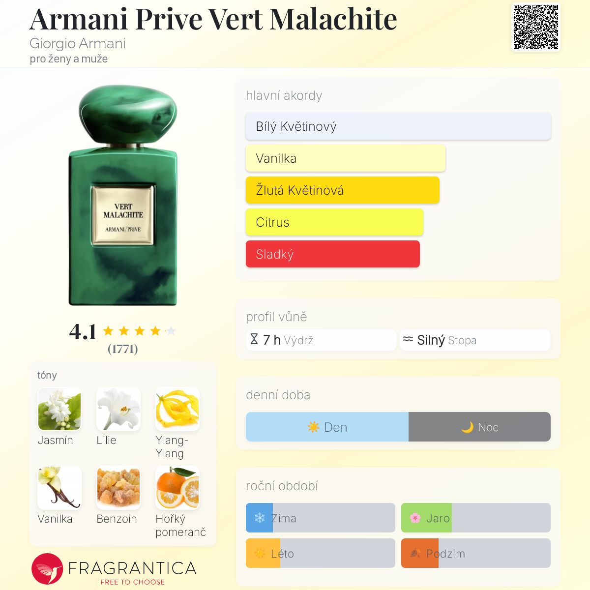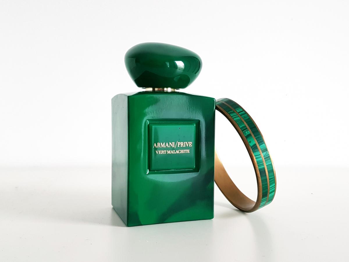 Armani Prive Vert Malachite podle Giorgio Armani je Woody Aromatic vůně pro ženy a muže. Armani Prive Vert Malachite byl/a uveden/a v roce 2016. "Nosem" za touto vůní je Fabrice Pellegrin. Vrchní tóny jsou Hořký pomeranč a Petitgrain; střední tóny jsouJasmín Sambac, Ylang-Ylang a Růžový pepř ; základní tóny jsou Lilie, Vanilka a Benzoin.