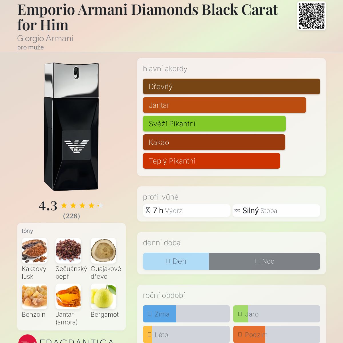 Emporio Armani Diamonds Black Carat for Him podle Giorgio Armani je Woody Spicy vůně pro muže. Emporio Armani Diamonds Black Carat for Him byl/a uveden/a v roce 2011. "Nosem" za touto vůní je Jacques Cavallier Belletrud. Vrchní tóny jsou Sečuánský pepř a Bergamot; střední tóny jsouKakao a Benzoin ; základní tóny jsou Guajakové dřevo, Jantar (ambra), Vetiver, Cedr a Dubový mech.