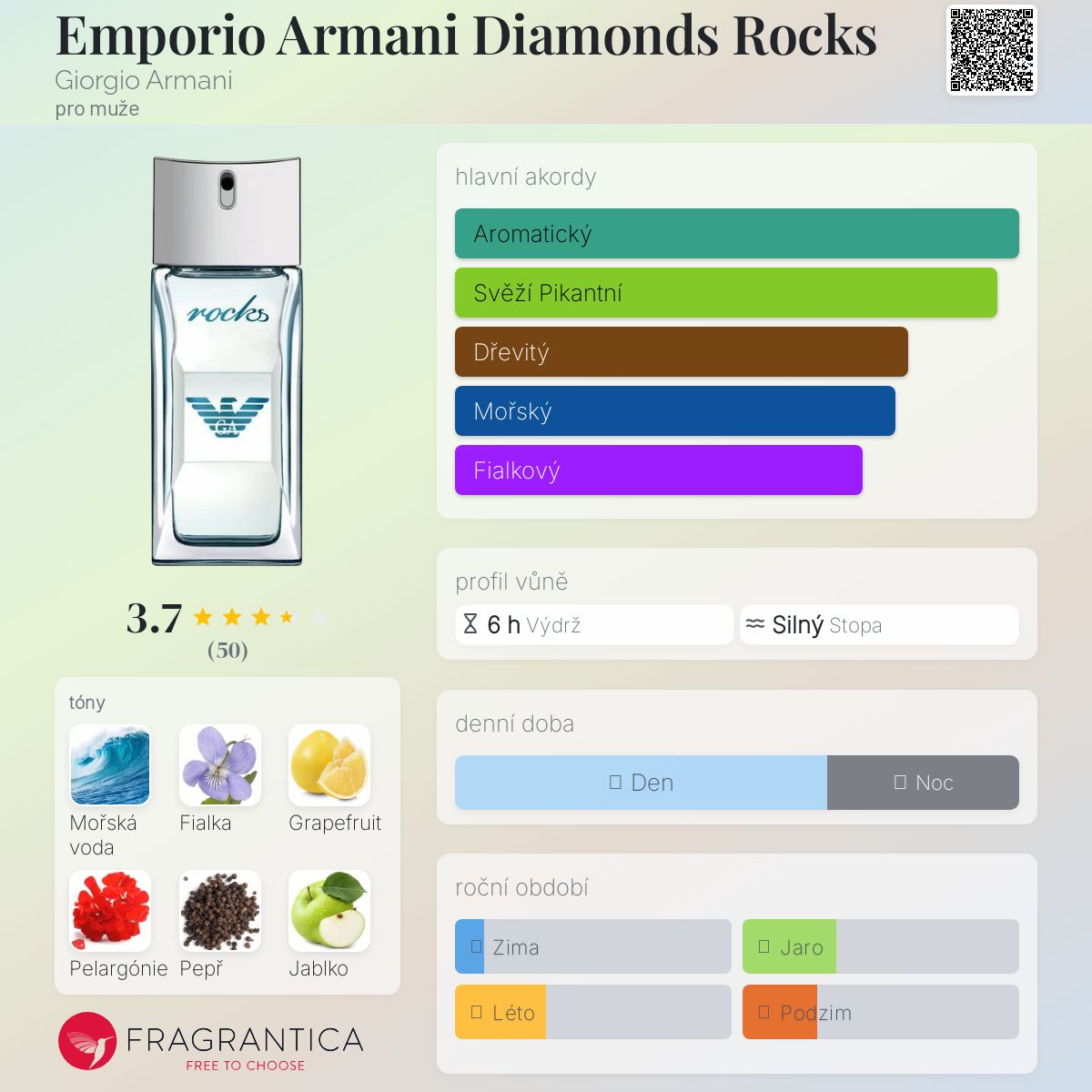 Emporio Armani Diamonds Rocks podle Giorgio Armani je Woody Aromatic vůně pro muže. Emporio Armani Diamonds Rocks byl/a uveden/a v roce 2014. Vrchní tóny jsou Grapefruit, Černý pepř a Jablko; střední tóny jsouMořské tóny, Fialka a Pelargónie ; základní tóny jsou Guajakové dřevo, Cedr a Vetiver.