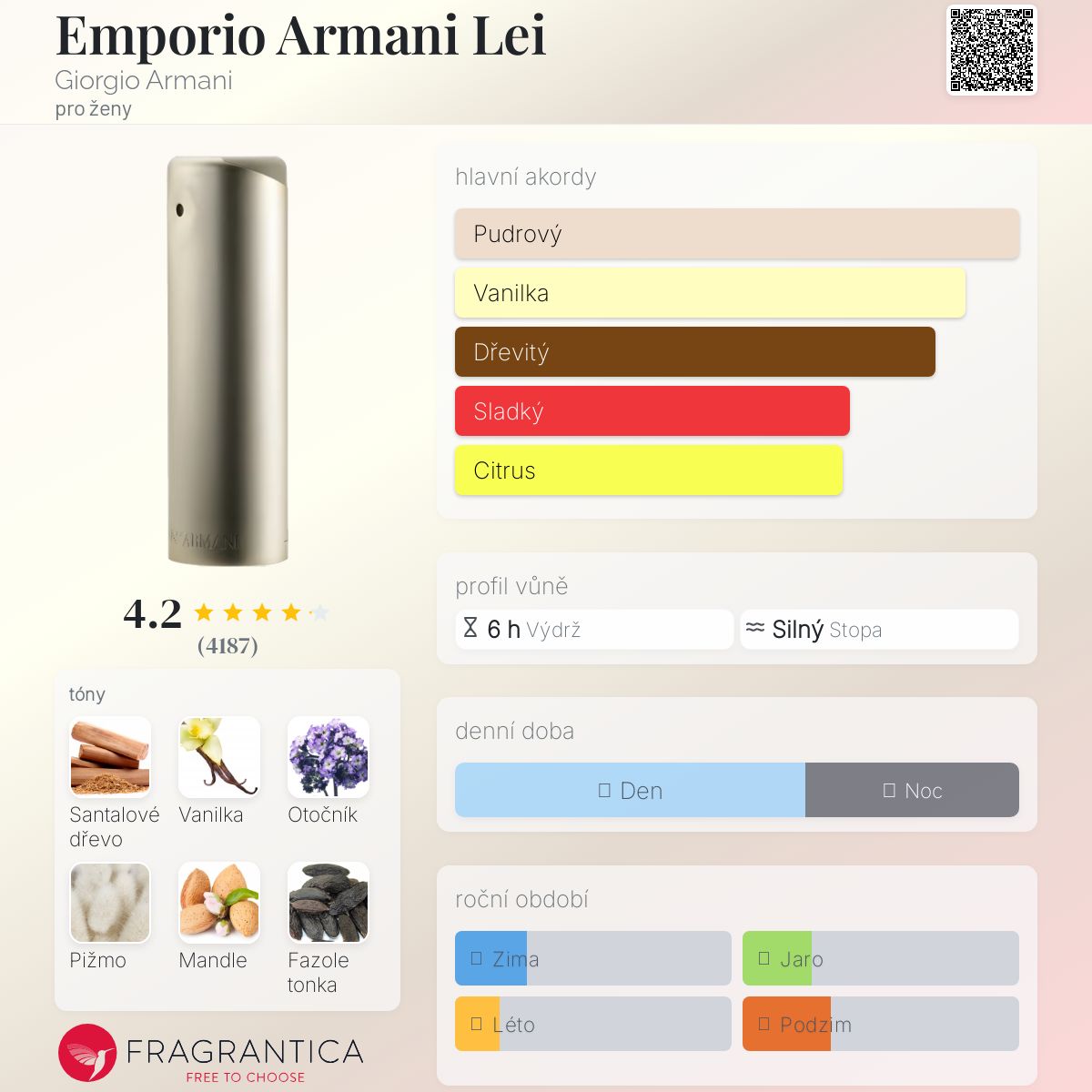 Emporio Armani Lei podle Giorgio Armani je Orientální Floral vůně pro ženy. Emporio Armani Lei byl/a uveden/a v roce 1998. "Nosem" za touto vůní je Daniela Andrier. Vrchní tóny jsou Limetka, Tuberóza, Bergamot, Hruška, Mandarinka a Ananas; střední tóny jsouOtočník, Kořen orris, Jasmín a Konvalinka ; základní tóny jsou Santalové dřevo, Vanilka, Pižmo, Mandle, Fazole tonka, Cedr a Jantar (ambra).