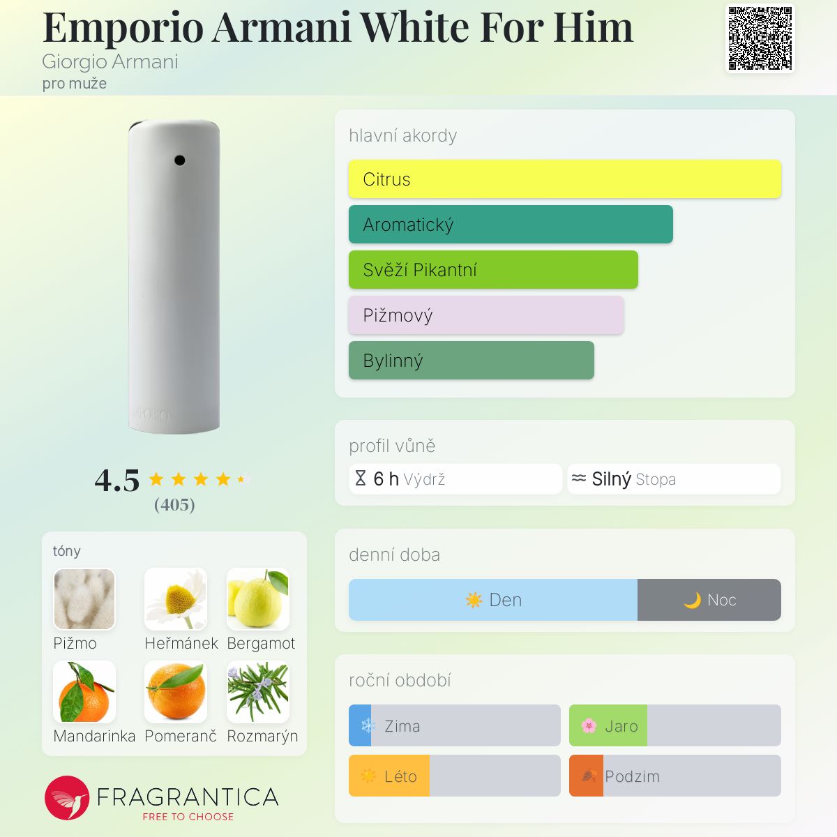 Emporio Armani White For Him podle Giorgio Armani je Citrus Aromatic vůně pro muže. Emporio Armani White For Him byl/a uveden/a v roce 2001. Emporio Armani White For Him byl/a vytvořen/a Clement Gavarry a Olivier Polge. Vrchní tóny jsou Bergamot, Mandarinka, Pomeranč a Citrón; střední tóny jsouHeřmánek, Rozmarýn a Kardamom ; základní tón je Pižmo.