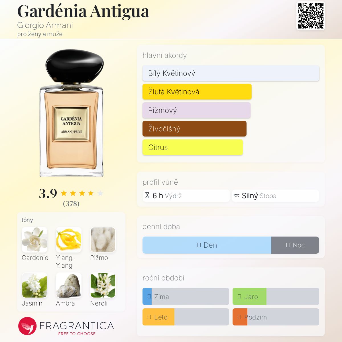 Gardénia Antigua podle Giorgio Armani je Floral Woody Musk vůně pro ženy a muže. Gardénia Antigua byl/a uveden/a v roce 2020. "Nosem" za touto vůní je Dora Baghriche. Vrchní tóny jsou Neroli, Mandarinka a Růžový pepř; střední tóny jsouGardénie, Ylang-Ylang a Jasmín ; základní tóny jsou Bílé pižmo, Ambra a Pačuli.