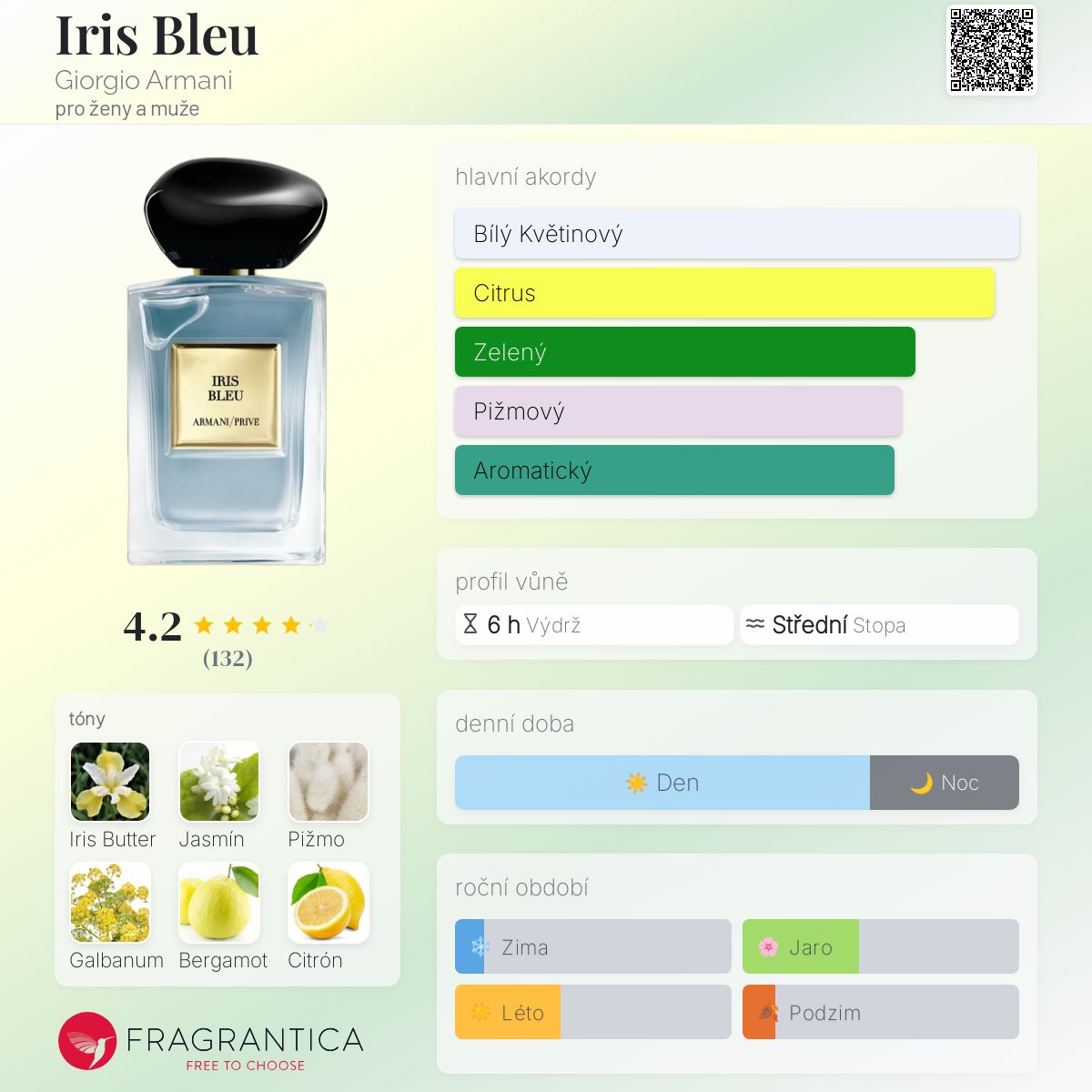 Iris Bleu podle Giorgio Armani je Woody Aromatic vůně pro ženy a muže. Toto je nová vůně. Iris Bleu byl/a uveden/a v roce 2025. "Nosem" za touto vůní je Dora Baghriche. Vrchní tóny jsou Galbanum, Bergamot a Citrón; střední tóny jsouKosatcové máslo a Jasmín ; základní tóny jsou Bílé pižmo, Virginský cedr a Guajakové dřevo.
