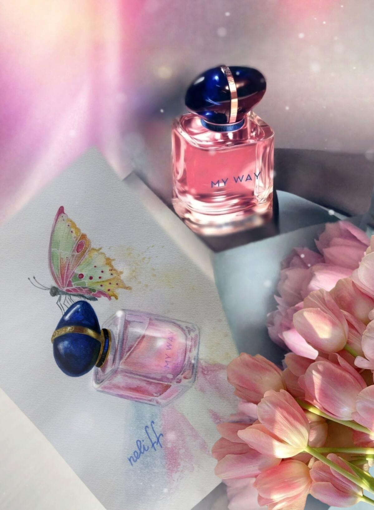 Nepopírám její podobnost s L'Interdit, ale to je kvůli kytici bílých květin, která charakterizuje obě vůně; tyto podobnosti se však omezují pouze na difuzní aspekt a také pokud voní na stuze. Při testování vůní vedle sebe je jasně vidět obrovský rozdíl mezi nimi. L'Interdit je komplexnější a hlubší a díky kombinaci pačuli, vetiveru a orientální vanilky je její základ exotičtější, temnější a její základ mnohem dřevitější a kouřovější! Je také více noční a zimní...., zatímco My Way je otevřená, slunečná a průzračná, mladistvější a snadno nositelná; dokonce i v poněkud teplejším podnebí... ale nenechte se zmást tím, že je to parfém zbavený osobnosti. Jeho vůně je omamná a její střední/vysoká intenzita je ideální pro ty, kteří chtějí být stylově nápadní, aniž by poškodili čich ostatních lidí.