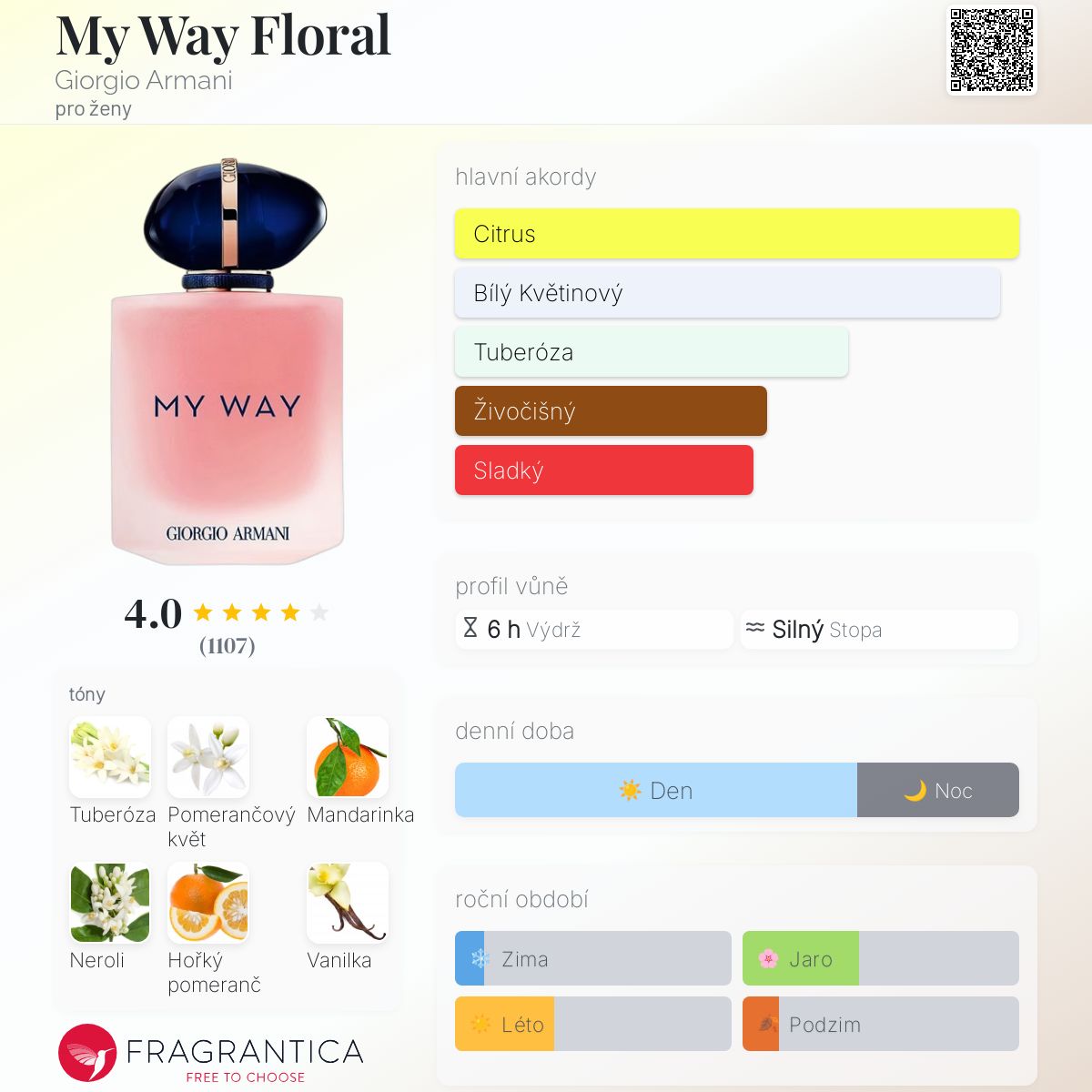 My Way Floral je okouzlující a znamenitý parfém! Je univerzální, bezpečná a snadno se líbí, těžko bude obtěžovat někoho ve vašem okolí. Velmi se vyplatí poznat jeho novou tvář a dát mu šanci, ale v klidu ho otestujte, nejlépe vedle toho tradičního, a ujistěte se, že opravdu stojí za to mít ve své sbírce obě verze.
