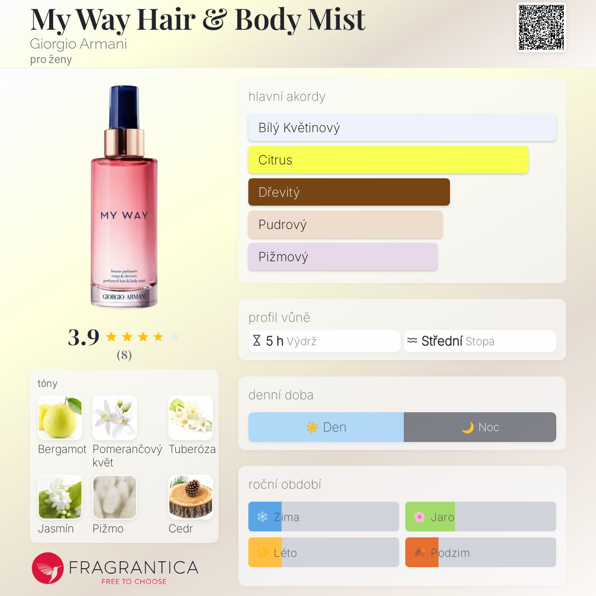 My Way Hair & Body Mist podle Giorgio Armani je Floral vůně pro ženy. Toto je nová vůně. My Way Hair & Body Mist byl/a uveden/a v roce 2023. Vrchní tóny jsou Bergamot a Pomerančový květ; střední tóny jsouTuberóza a Jasmín ; základní tóny jsou Bílé pižmo, Virginský cedr a Madagaskarská vanilka.