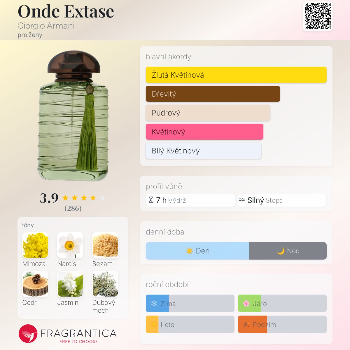 Onde Extase podle Giorgio Armani je Orientální Floral vůně pro ženy. Onde Extase byl/a uveden/a v roce 2008. "Nosem" za touto vůní je Bruno Jovanovic.