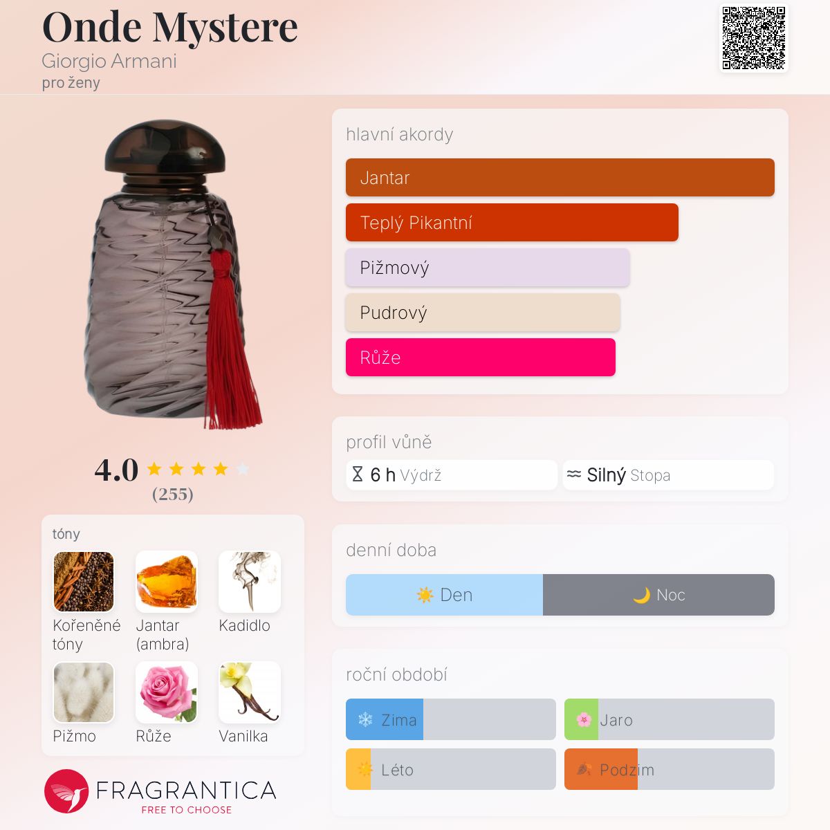 Onde Mystere podle Giorgio Armani je Orientální Spicy vůně pro ženy. Onde Mystere byl/a uveden/a v roce 2008. Vrchní tóny jsou Jantar (ambra), Pižmo a Marocká růže; střední tóny jsouKadidlo a Vanilka ; základní tón je Kořeněné tóny.