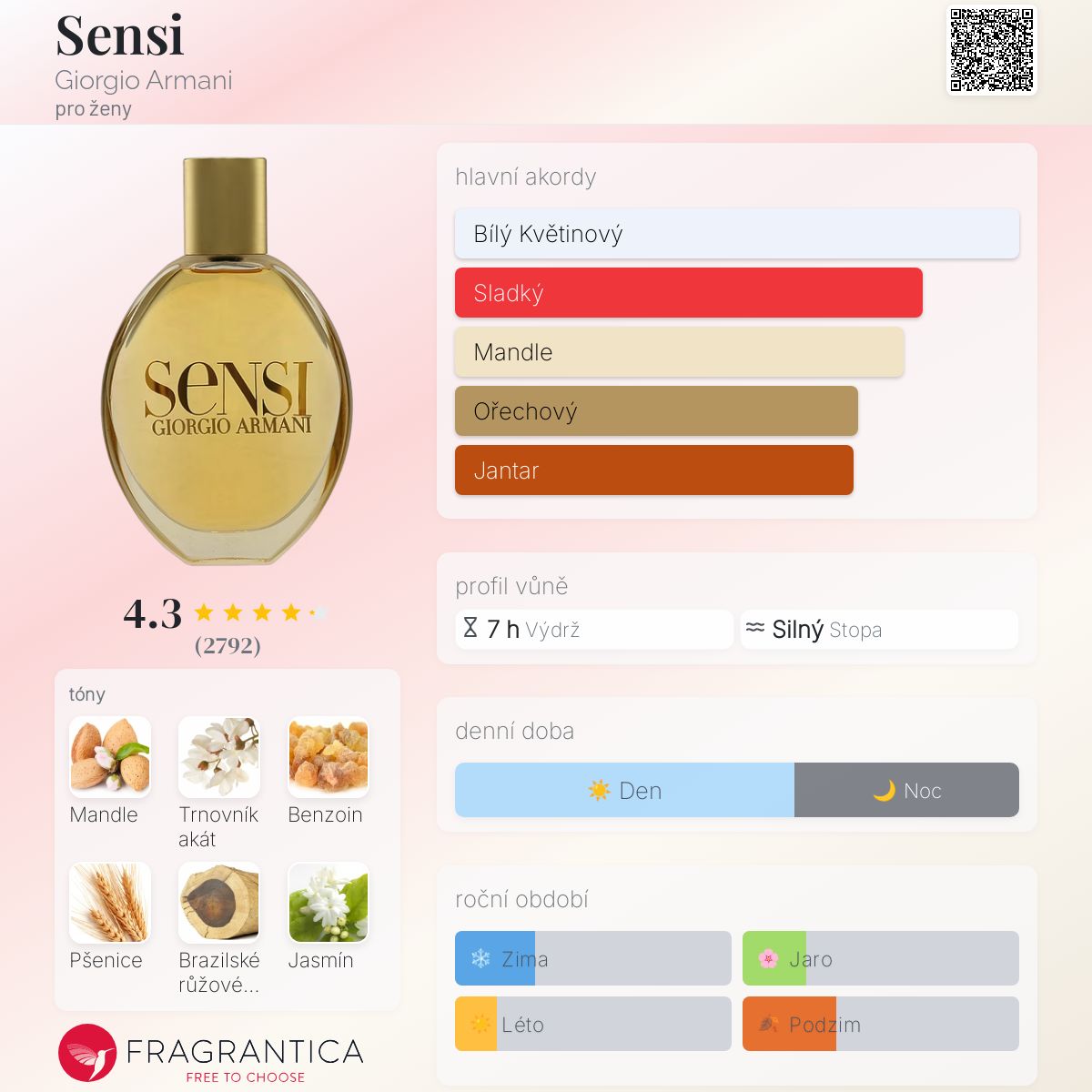Sensi podle Giorgio Armani je Orientální Woody vůně pro ženy. Sensi byl/a uveden/a v roce 2002. Sensi byl/a vytvořen/a Alberto Morillas a Jacques Cavallier Belletrud. Vrchní tóny jsou Trnovník akát a Limetka; střední tóny jsouMandle, Pšenice a Jasmín ; základní tóny jsou Benzoin a Brazilské růžové dřevo.