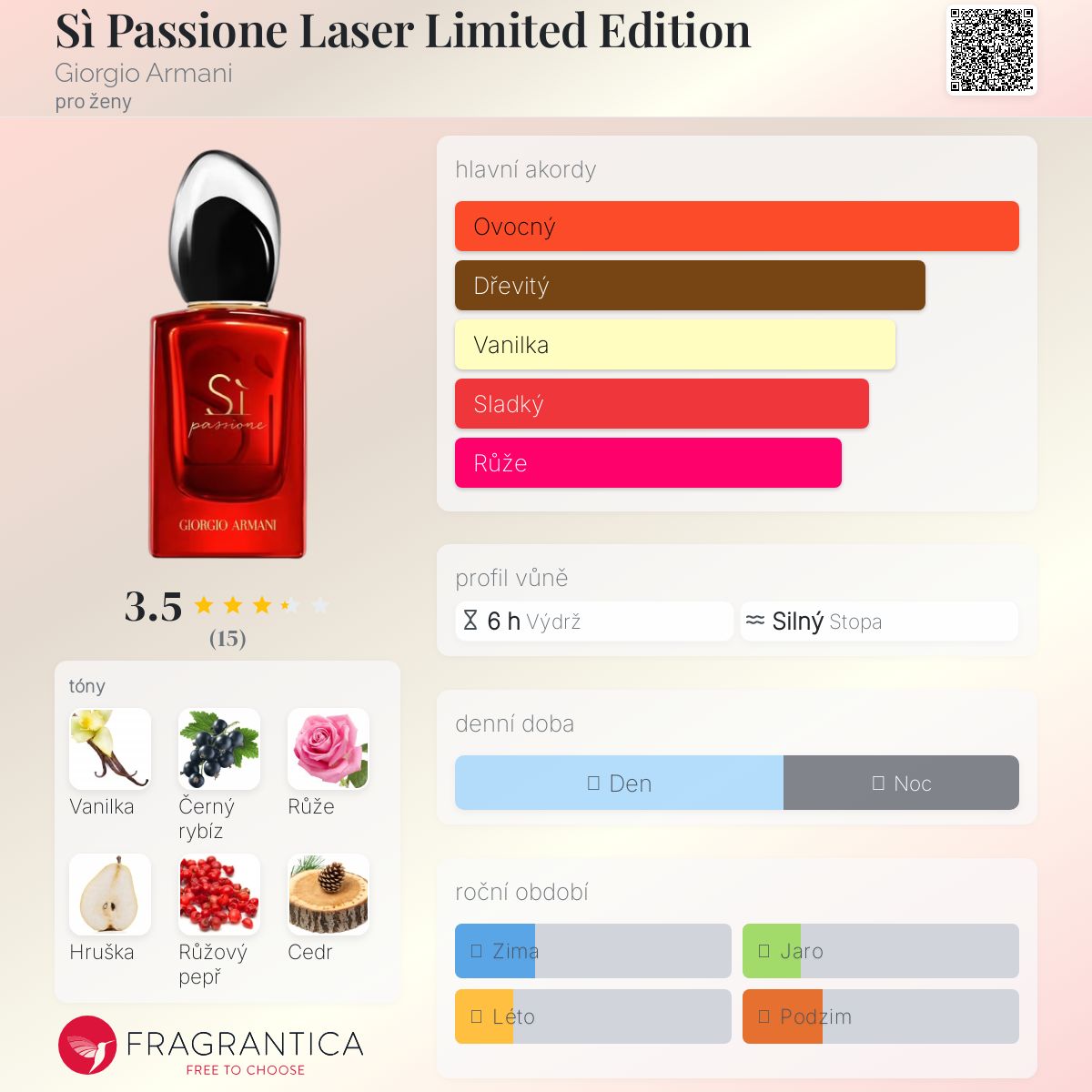 Sì Passione Laser Limited Edition podle Giorgio Armani je vůně pro ženy. Sì Passione Laser Limited Edition byl/a uveden/a v roce 2022. Sì Passione Laser Limited Edition byl/a vytvořen/a Christine Nagel a Julie Massé. Vrchní tóny jsou Černý rybíz, Hruška, Růžový pepř a Grapefruit; střední tóny jsouRůže, Jasmín, Ananas a Otočník ; základní tóny jsou Vanilka, Cedr, Pačuli a Jantarové dřevo.