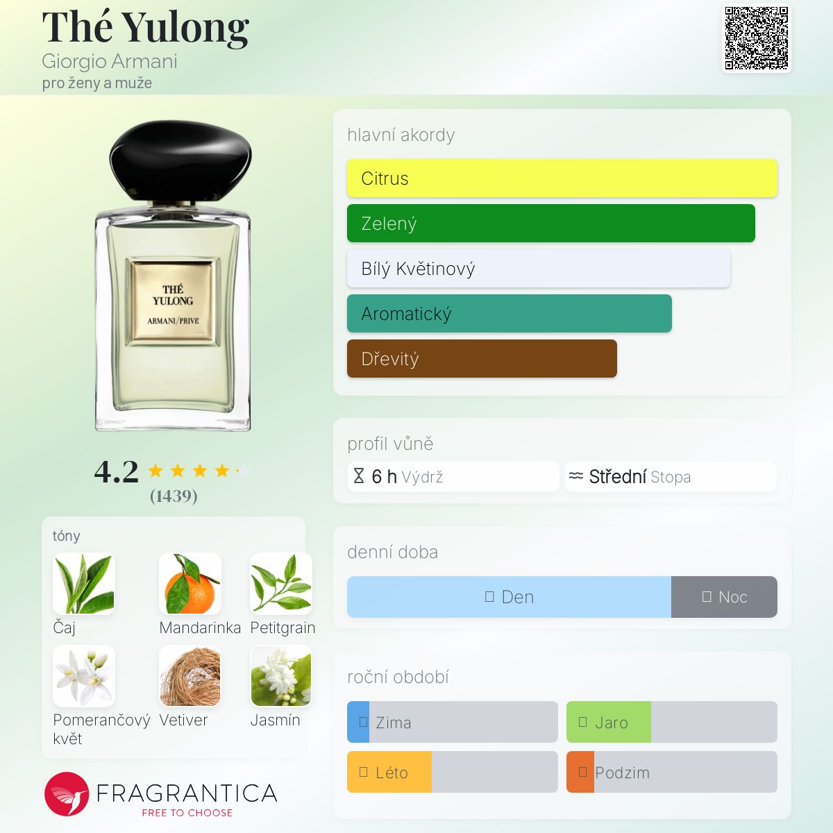 Thé Yulong podle Giorgio Armani je Aromatic Green vůně pro ženy a muže. Thé Yulong byl/a uveden/a v roce 2020. "Nosem" za touto vůní je Julie Massé. Vrchní tóny jsou Mandarinka, Petitgrain a Kardamom; střední tóny jsouZelený čaj, Černý čaj, Pomerančový květ a Jasmín ; základní tóny jsou Vetiver, Ambrette (přírodní pižmo) a Kosatec.