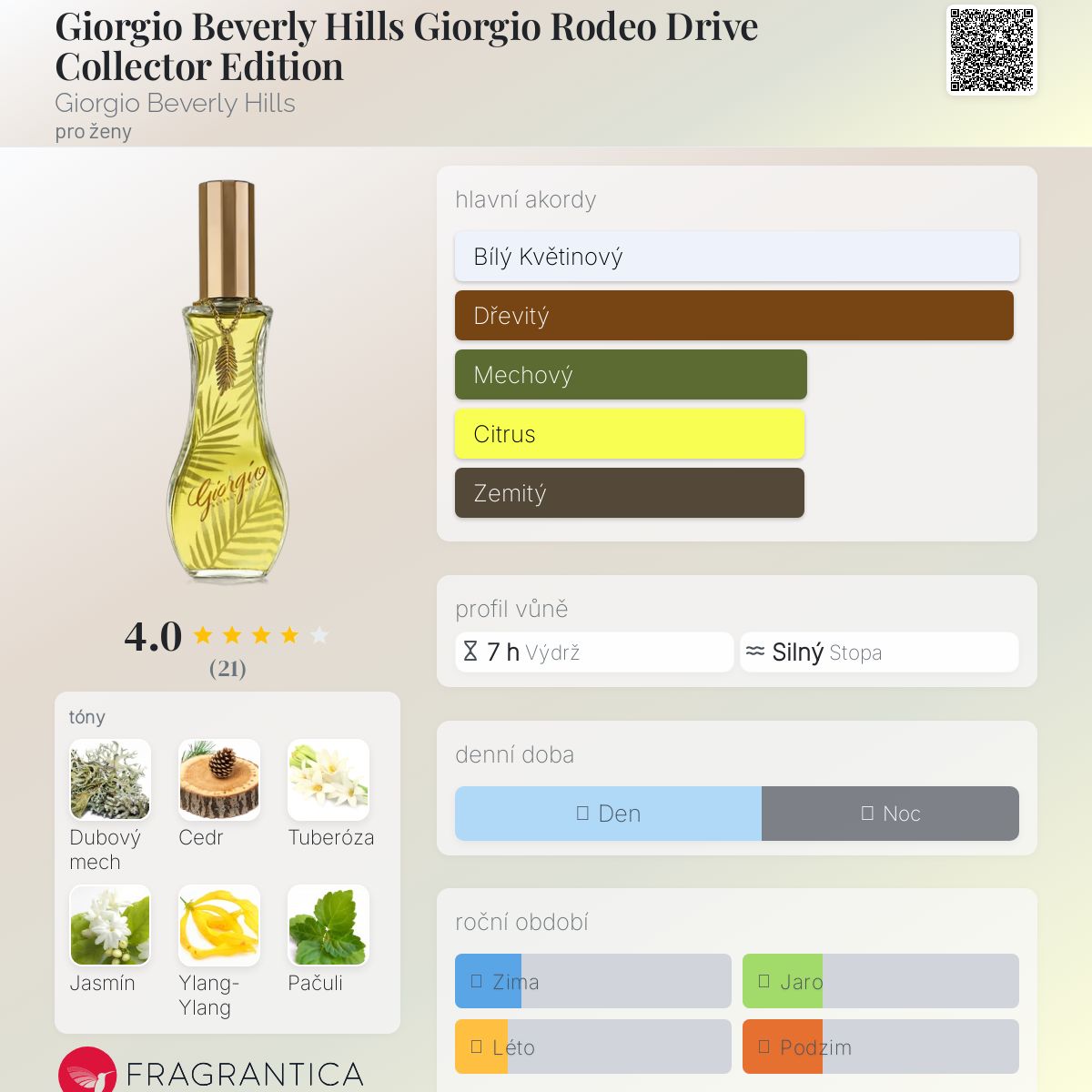 Giorgio Beverly Hills Giorgio Rodeo Drive Collector Edition podle Giorgio Beverly Hills je Floral vůně pro ženy. Giorgio Beverly Hills Giorgio Rodeo Drive Collector Edition byl/a uveden/a v roce 2016. Vrchní tóny jsou Bergamot a Pomerančový květ; střední tóny jsouTuberóza, Jasmín, Ylang-Ylang a Gardénie ; základní tóny jsou Mech, Cedr, Pačuli, Santalové dřevo a Vanilka.
