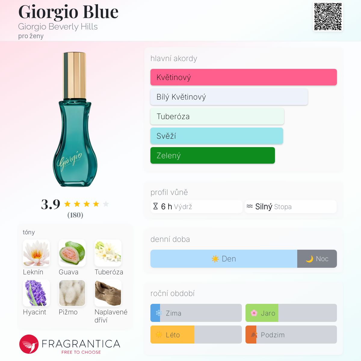 Giorgio Blue podle Giorgio Beverly Hills je Floral Fruity vůně pro ženy. Giorgio Blue byl/a uveden/a v roce 2016. "Nosem" za touto vůní je Harry Fremont. Vrchní tóny jsou Guava, Hyacint a Mandarinka; střední tóny jsouLeknín, Tuberóza a Jasmín ; základní tóny jsou Pižmo, Naplavené dříví, Vanilka a Dubový mech.