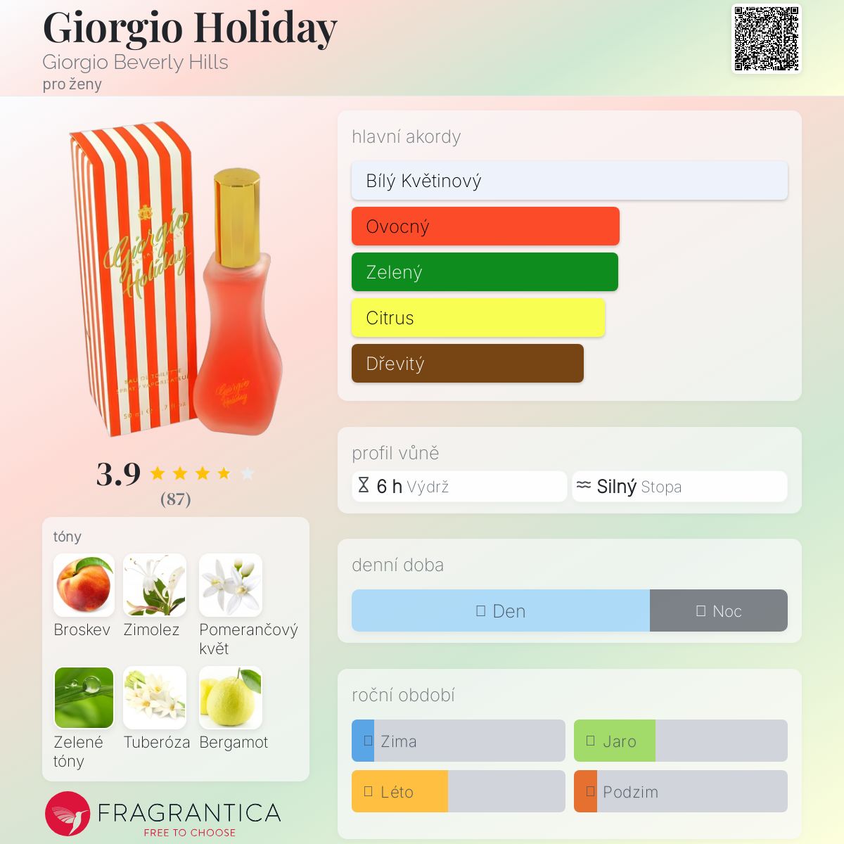 Giorgio Holiday podle Giorgio Beverly Hills je Floral Fruity vůně pro ženy. Giorgio Holiday byl/a uveden/a v roce 1998. "Nosem" za touto vůní je Annick Menardo. Vrchní tóny jsou Broskev, Pomerančový květ, Zelené tóny a Bergamot; střední tóny jsouZimolez, Tuberóza, Jasmín a Konvalinka ; základní tóny jsou Jantar (ambra), Santalové dřevo, Vanilka a Cedr.