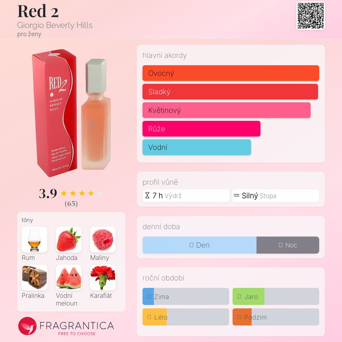 Red 2 podle Giorgio Beverly Hills je Floral Fruity Gourmand vůně pro ženy. Red 2 byl/a uveden/a v roce 1996. Vrchní tóny jsou Rum, Velká jahoda, Maliny a Vodní meloun; střední tóny jsouKarafiát, Hruška, Frézie, Růže, Hyacint, Broskev, Jasmín a Pivoňka ; základní tóny jsou Pralinka, Vanilka a Dřevité tóny.