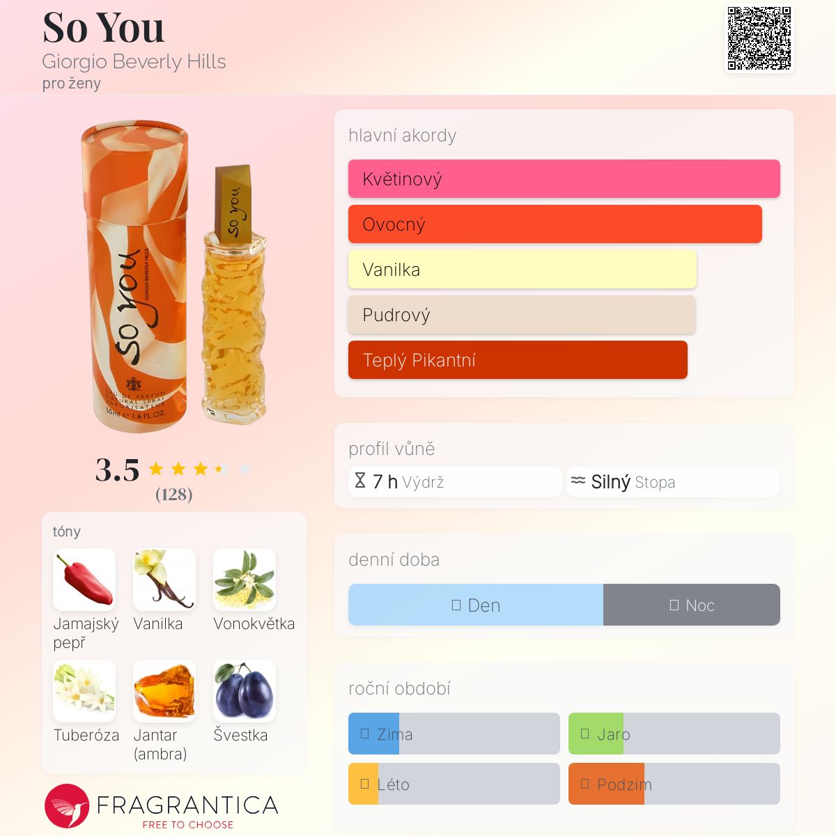 So You podle Giorgio Beverly Hills je Orientální Floral vůně pro ženy. So You byl/a uveden/a v roce 2002. "Nosem" za touto vůní je Francoise Caron. Vrchní tóny jsou Vonokvětka a Švestka; střední tóny jsouPaprika, Tuberóza, Leknín, Růže a Fialka ; základní tóny jsou Vanilka, Jantar (ambra) a Pižmo.