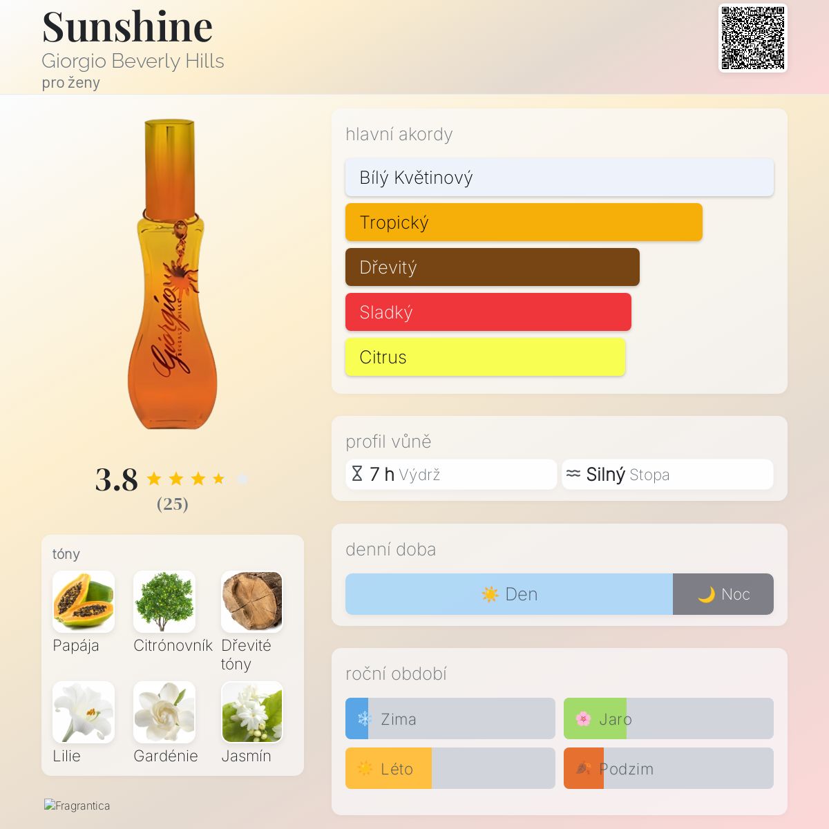 Sunshine podle Giorgio Beverly Hills je Orientální Floral vůně pro ženy. Sunshine byl/a uveden/a v roce 2009. Vrchní tóny jsou Papája, Citrónovník, Lilie a Mandarinka; střední tóny jsouGardénie, Jasmín, Pivoňka a Květ tiare ; základní tóny jsou Dřevité tóny, Jantar (ambra), Pižmo a Švestka.