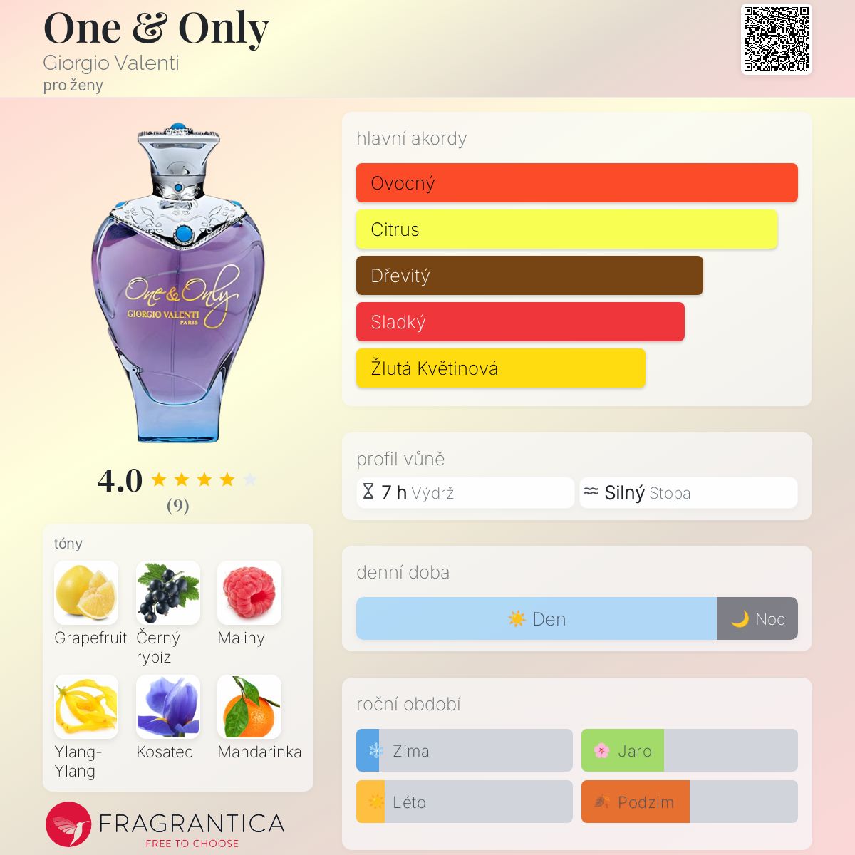 One & Only podle Giorgio Valenti je Floral Fruity vůně pro ženy. Vrchní tóny jsou Grapefruit, Černý rybíz a Mandarinka; střední tóny jsouYlang-Ylang, Bambus a Růže ; základní tóny jsou Maliny, Kosatec, Pačuli a Pižmo.