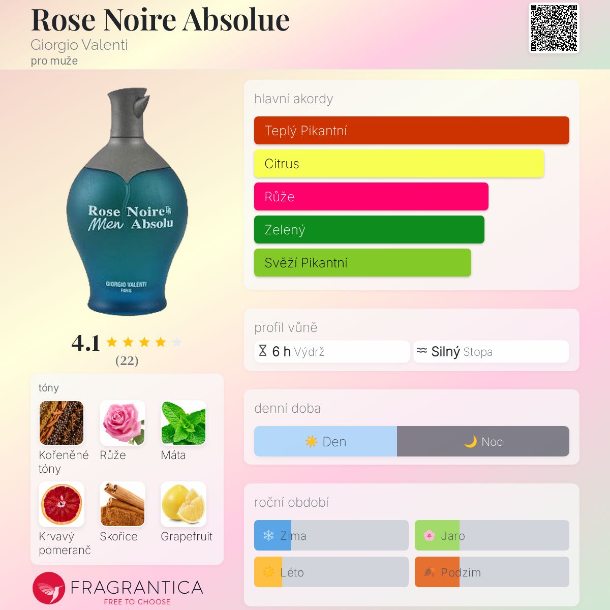 Rose Noire Absolue podle Giorgio Valenti je Aromatic vůně pro muže. Vrchní tóny jsou Máta peprná, Krvavý pomeranč a Grapefruit; střední tóny jsouKoření, Růže a Skořice ; základní tóny jsou Jantar (ambra), Kůže, Pačuli a Bílé dřevo.
