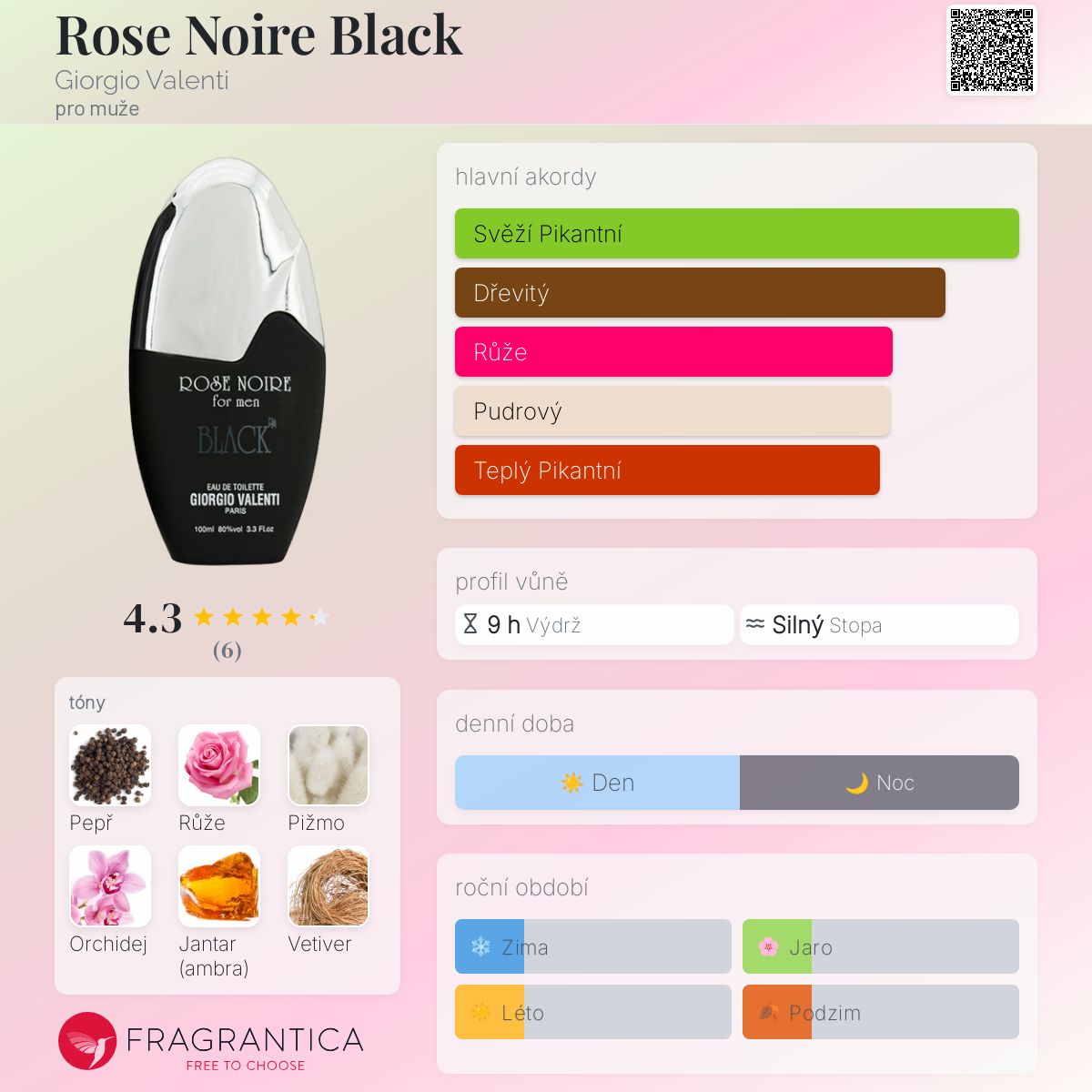 Rose Noire Black podle Giorgio Valenti je Woody Aromatic vůně pro muže. Vrchní tóny jsou Bergamot, Mandarinka a Fialka; střední tóny jsouPepř, Černý pepř, Růže, Černá orchidej a Cedr ; základní tóny jsou Pižmo, Jantar (ambra), Vetiver, Pačuli a Santalové dřevo.