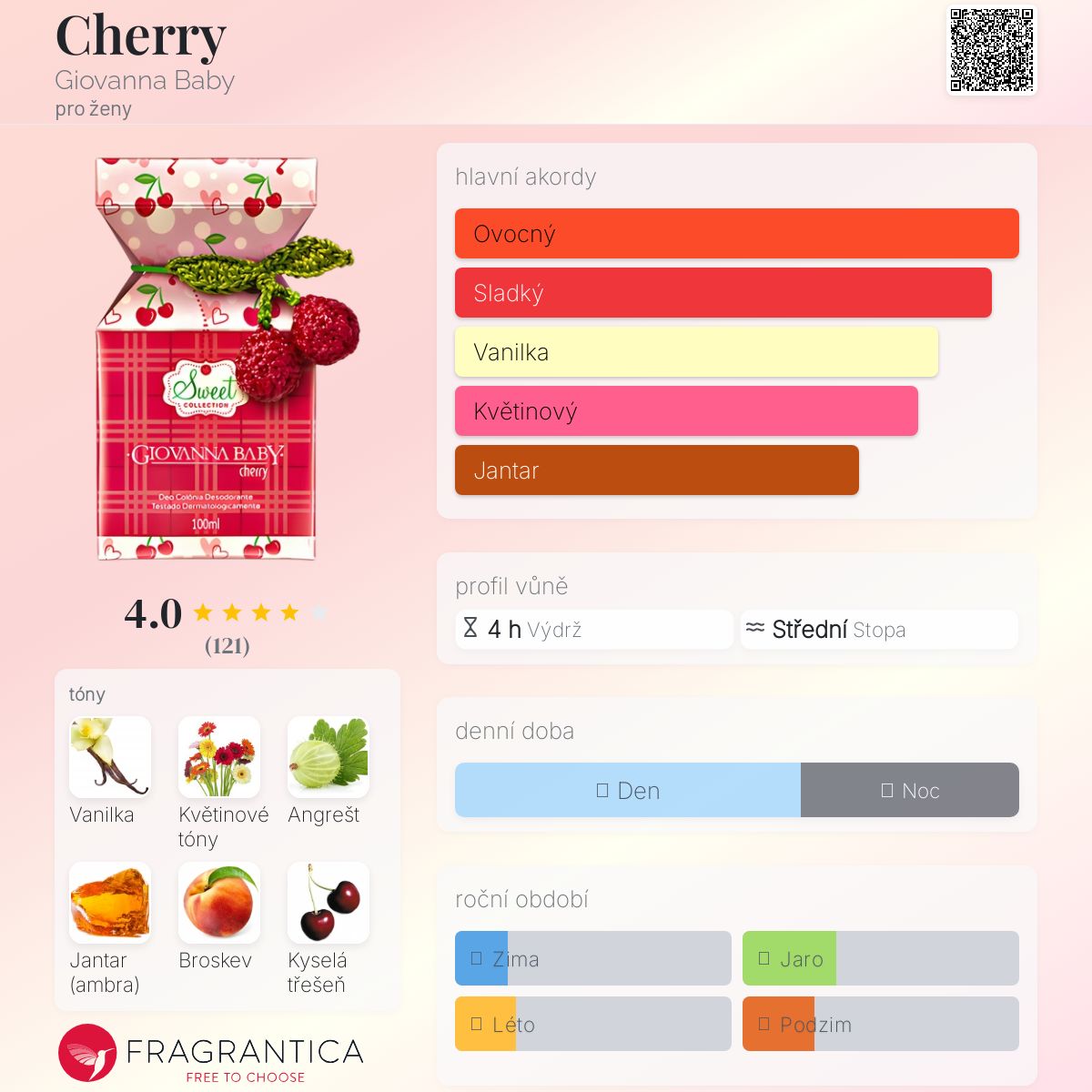 Cherry podle Giovanna Baby je Floral Fruity vůně pro ženy. Cherry byl/a uveden/a v roce 2014. "Nosem" za touto vůní je Maria Tereza Belotti. Vrchní tóny jsou Angrešt, Broskev, Kyselá třešeň, Liči a Pomelo; střední tón jeKvětinové tóny ; základní tóny jsou Vanilka a Jantar (ambra).