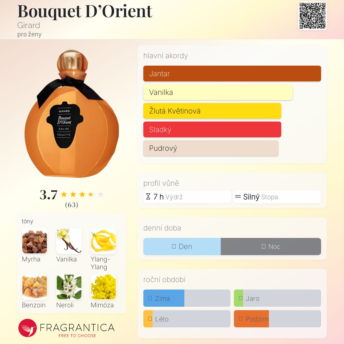 Bouquet D’Orient podle Girard je Orientální Spicy vůně pro ženy. Vrchní tóny jsou Neroli, Citron amalfi a Bergamot; střední tóny jsouYlang-Ylang, Mimóza, Kosatec, Orris, Černý rybíz, Fialkový list a Tinktura z růže ; základní tóny jsou Myrha, Vanilka, Benzoin, Fazole tonka a Pačuli.