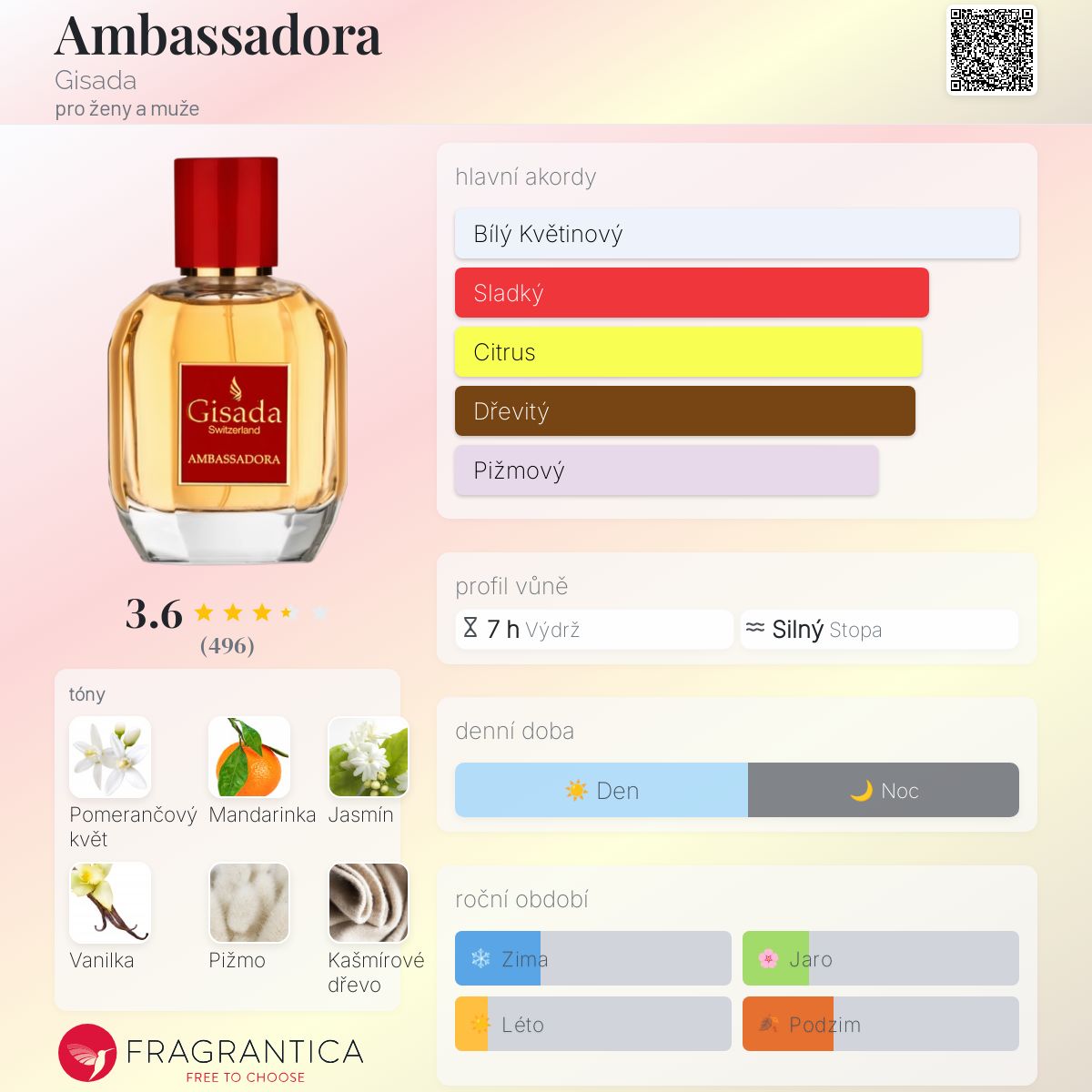 Ambassadora podle Gisada je vůně pro ženy a muže. Ambassadora byl/a uveden/a v roce 2021. Vrchní tóny jsou Mandarinka, Růžový pepř, Borůvky a Fialkový list; střední tóny jsouPomerančový květ, Jasmín, Kašmírové dřevo a Frézie ; základní tóny jsou Vanilka, Pižmo, Santalové dřevo, Cukr a Vetiver.