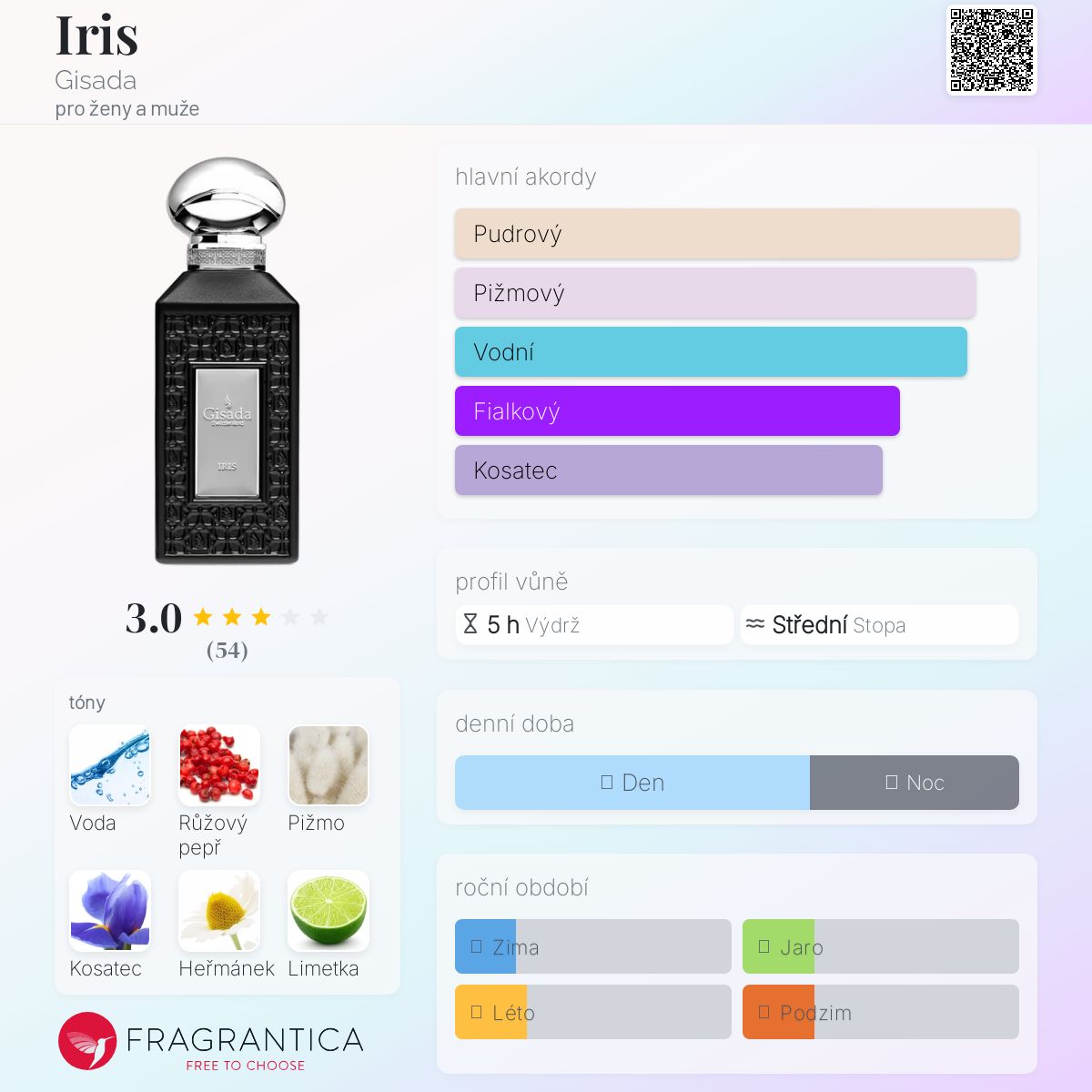 Iris podle Gisada je Floral Woody Musk vůně pro ženy a muže. Iris byl/a uveden/a v roce 2021. "Nosem" za touto vůní je Andreas Wilhelm. Vrchní tóny jsou Růžový pepř, Heřmánek a Limetka; střední tóny jsouVodní tóny, Kosatec, Fialka, Růže a Bílý jantar (ambra) ; základní tóny jsou Bílé pižmo, Haitský vetiver a Santalové dřevo.