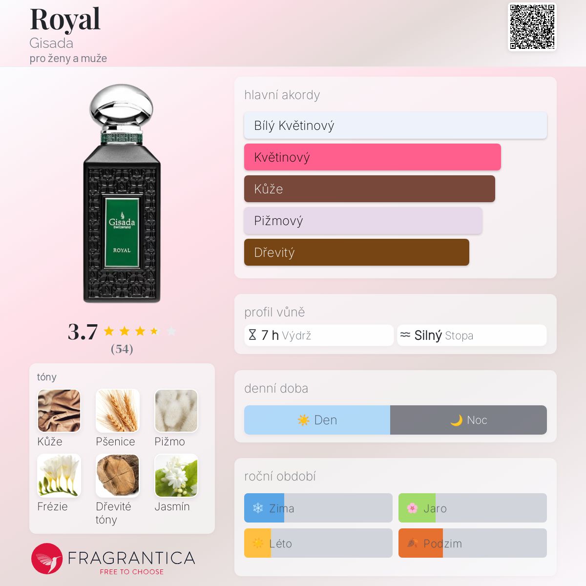 Royal podle Gisada je Orientální Woody vůně pro ženy a muže. Royal byl/a uveden/a v roce 2021. Vrchní tóny jsou Kůže, Pšenice a Jasmín; střední tóny jsouFrézie, Konvalinka a Agarové dřevo (oud) ; základní tóny jsou Pižmo, Dřevité tóny, Vanilka a Jantar (ambra).