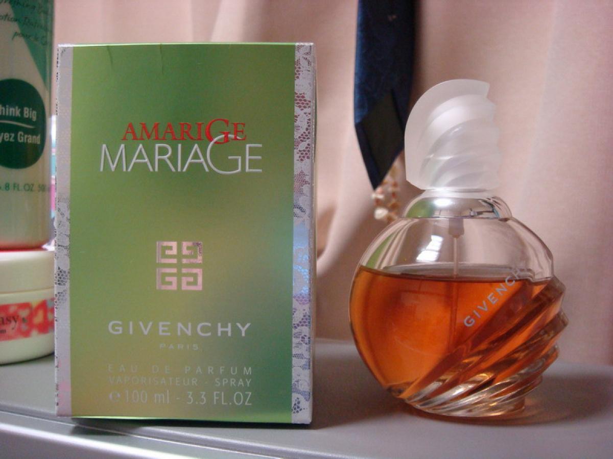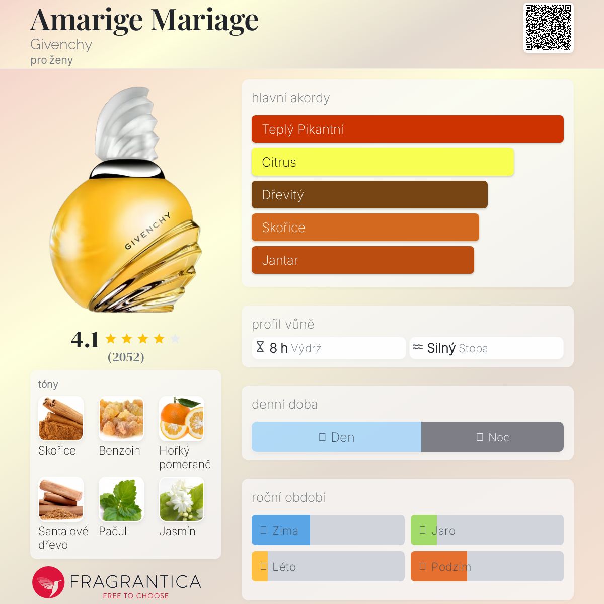 Amarige Mariage podle Givenchy je Floral vůně pro ženy. Amarige Mariage byl/a uveden/a v roce 2006. Vrchní tóny jsou Hořký pomeranč a Bergamot; střední tóny jsouSkořice, Jasmín a Magnólie ; základní tóny jsou Benzoin, Santalové dřevo a Pačuli.