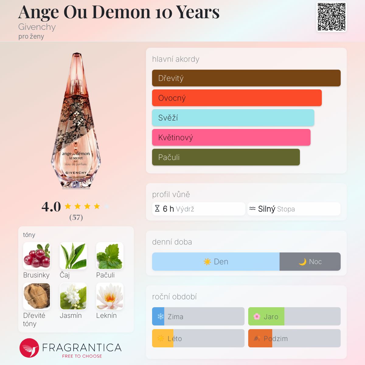 Ange Ou Demon 10 Years podle Givenchy je Floral Fruity vůně pro ženy. Ange Ou Demon 10 Years byl/a uveden/a v roce 2016. Vrchní tóny jsou Brusinky, Zelený čaj a Italský citrón; střední tóny jsouJasmín, Leknín a Pivoňka ; základní tóny jsou Pačuli, Bílé dřevo a Pižmo.
