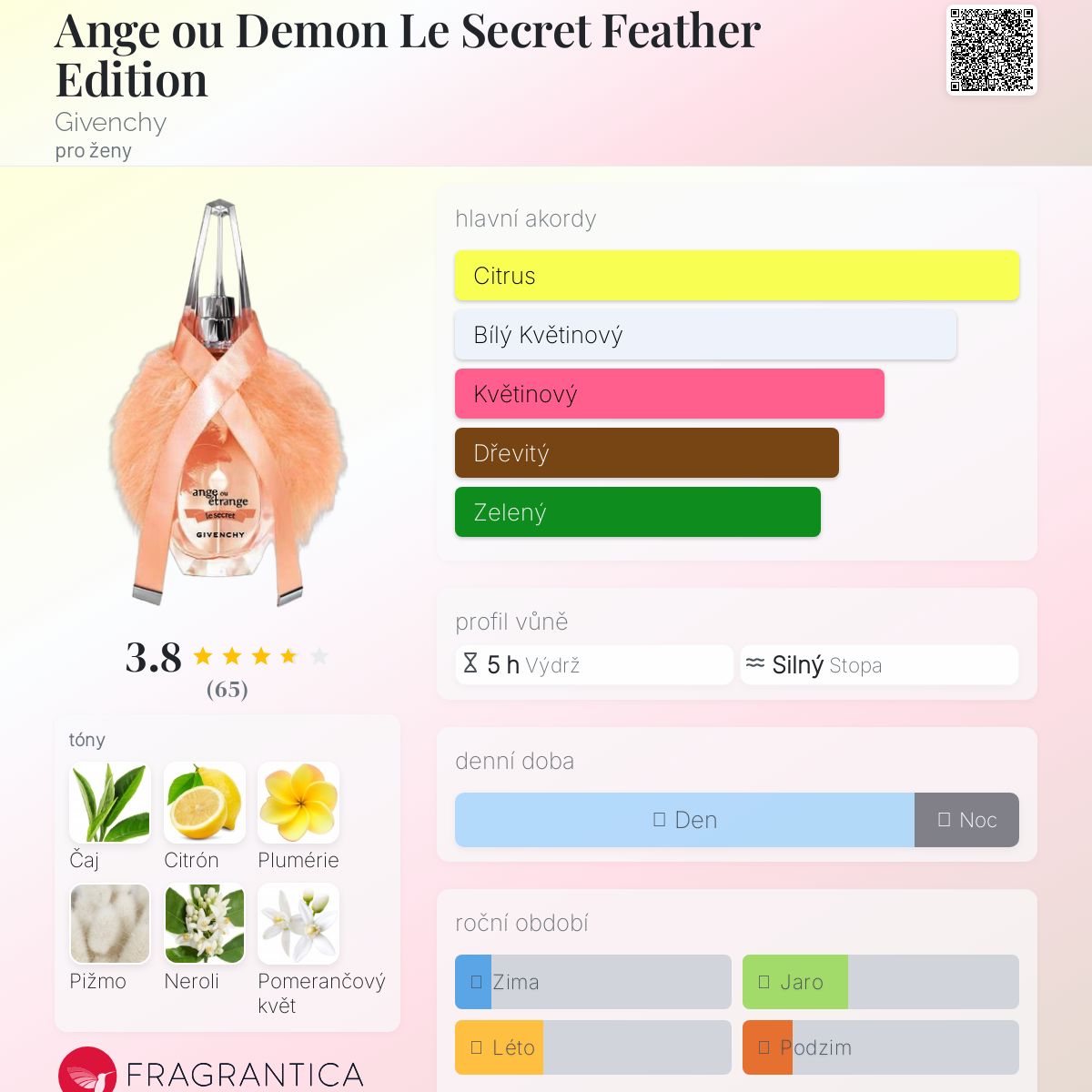 Ange ou Demon Le Secret Feather Edition podle Givenchy je Floral Woody Musk vůně pro ženy. Ange ou Demon Le Secret Feather Edition byl/a uveden/a v roce 2013. Vrchní tóny jsou Čajový lístek, Citrón a Neroli; střední tóny jsouPlumérie, Pomerančový květ a Jasmín ; základní tóny jsou Bílé pižmo, Cedr, Pačuli a Vanilka.