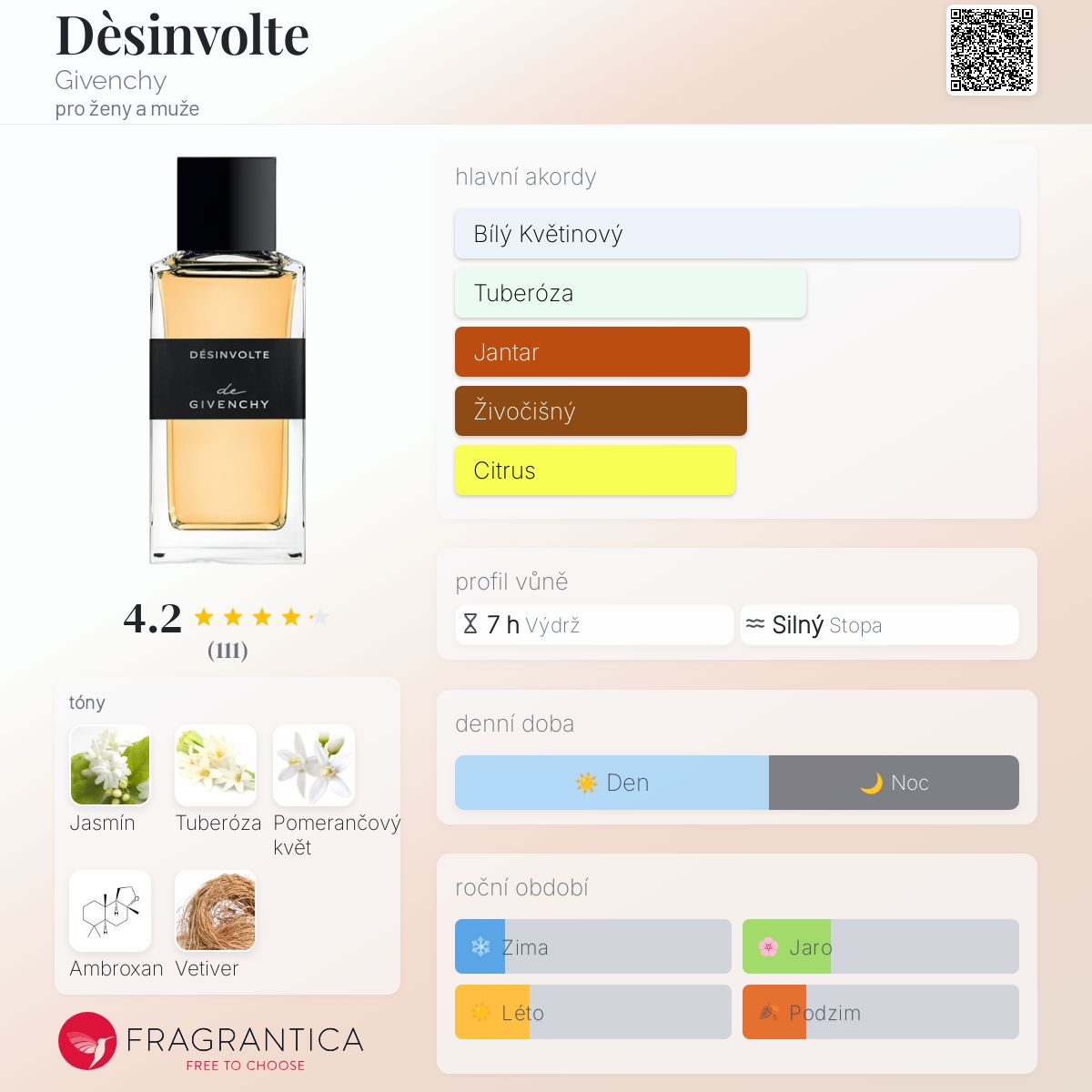 Dèsinvolte podle Givenchy je Orientální Floral vůně pro ženy a muže. Dèsinvolte byl/a uveden/a v roce 2021. Vrchní tóny jsou Tuberóza a Haitský vetiver; střední tóny jsouJasmín a Pomerančový květ ; základní tón je Ambroxan.