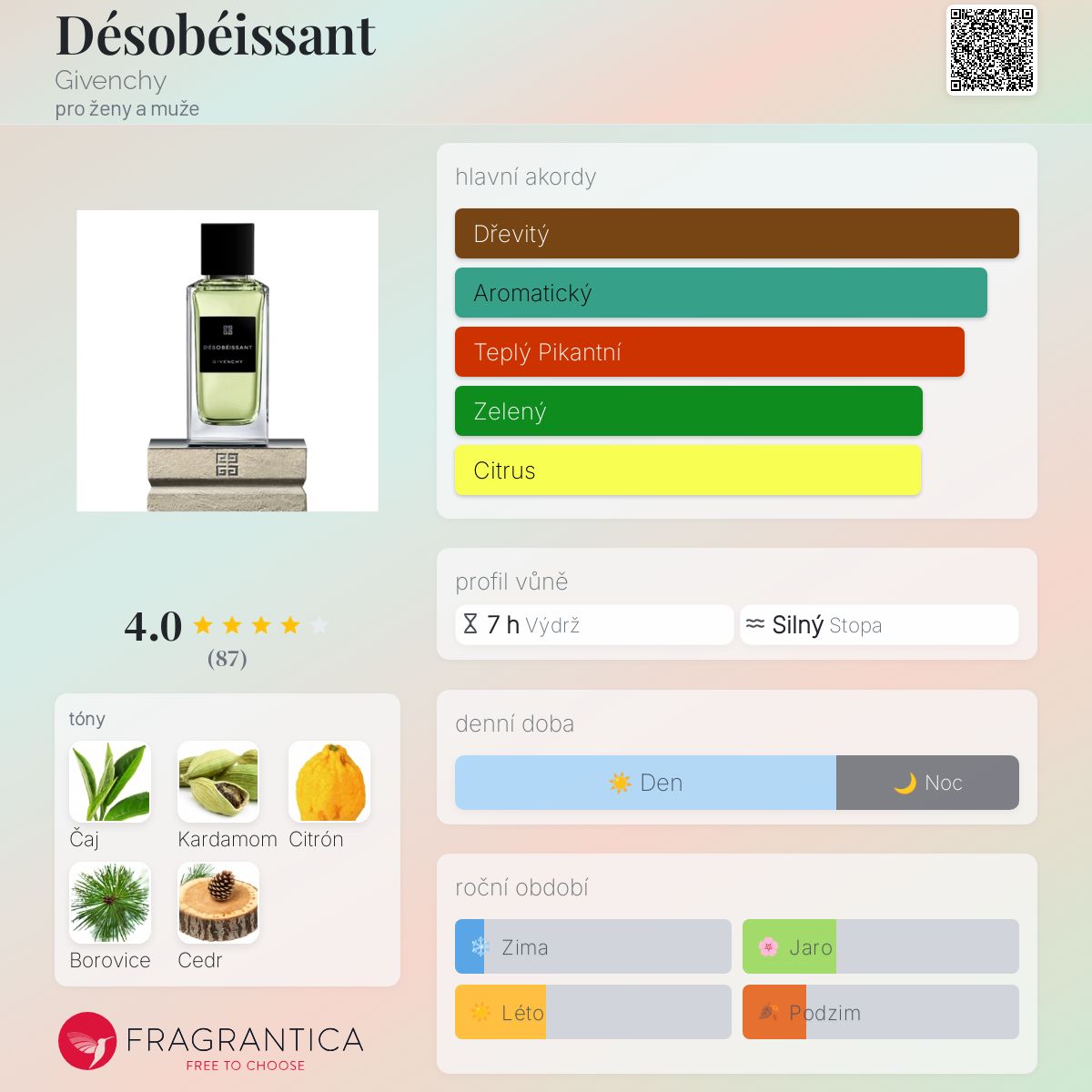Désobéissant podle Givenchy je Woody Spicy vůně pro ženy a muže. Toto je nová vůně. Désobéissant byl/a uveden/a v roce 2025. Vrchní tón je Zedrát ; střední tóny jsouČerný čaj a Kardamom ; základní tóny jsou Borovice a Cedr.