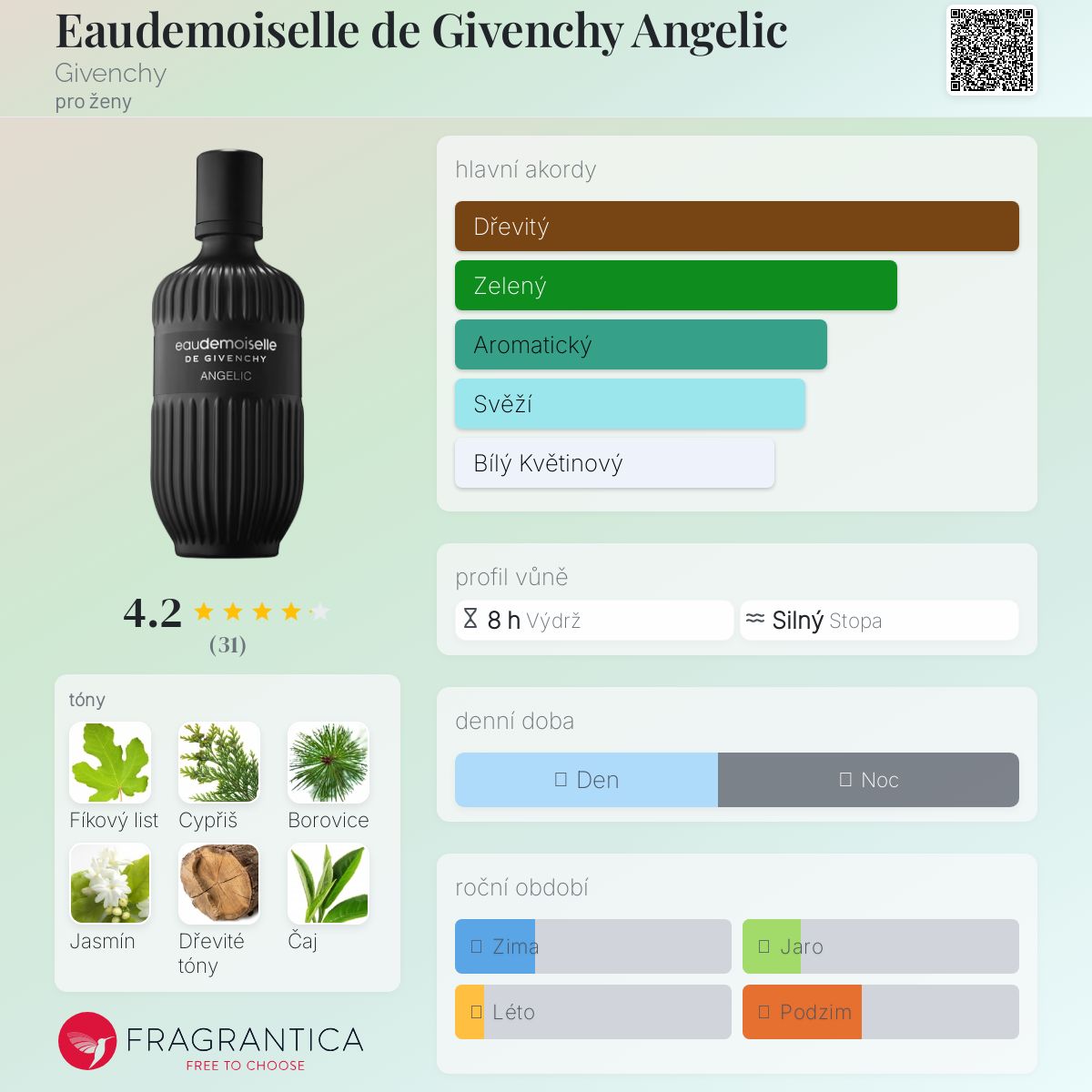 Eaudemoiselle de Givenchy Angelic podle Givenchy je Floral vůně pro ženy. Eaudemoiselle de Givenchy Angelic byl/a uveden/a v roce 2017. Vrchní tóny jsou Fíkový list, Jasmín mnohokvětý a Čaj; střední tóny jsouCypřiš a Jehličí borovice ; základní tóny jsou Dřevité tóny, Pačuli a Pižmo.