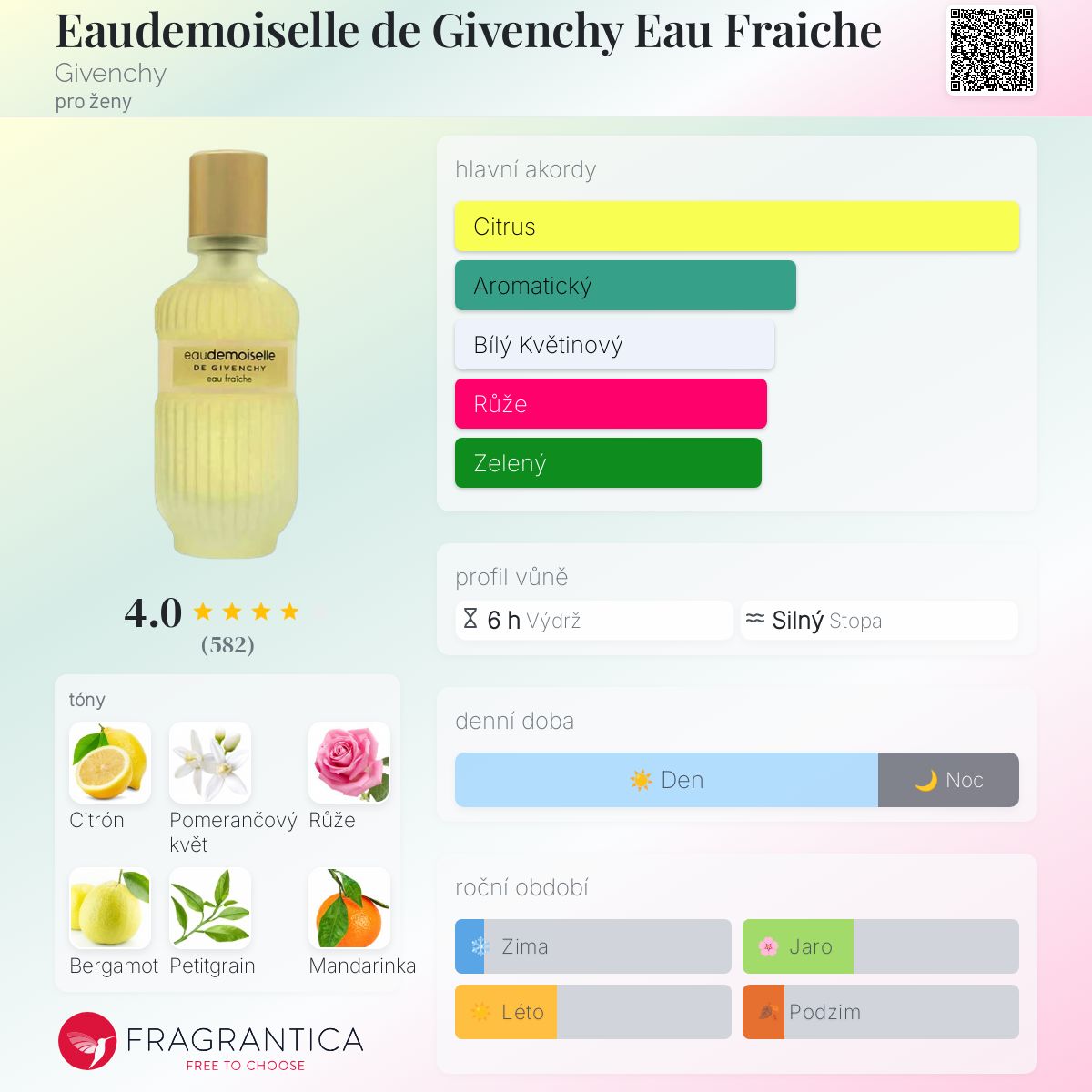 Eaudemoiselle de Givenchy Eau Fraiche podle Givenchy je Floral vůně pro ženy. Eaudemoiselle de Givenchy Eau Fraiche byl/a uveden/a v roce 2012. Vrchní tóny jsou Citrón, Bergamot, Petitgrain a Mandarinka; střední tóny jsouPomerančový květ, Růže, Rebarbora a Fialka ; základní tón je Pižmo.