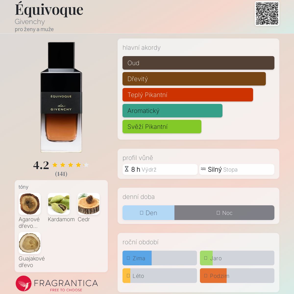 Équivoque podle Givenchy je Woody Spicy vůně pro ženy a muže. Équivoque byl/a uveden/a v roce 2022. Vrchní tón je Guatemalský kardamom ; střední tóny jsouAtlasový cedr, Virginský cedr a Guajakové dřevo ; základní tón je Agarové dřevo (oud).