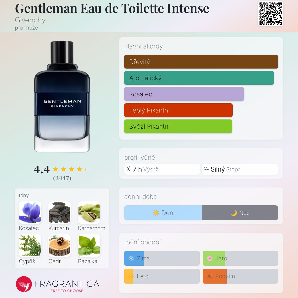 Gentleman Eau de Toilette Intense podle Givenchy je Woody Aromatic vůně pro muže. Gentleman Eau de Toilette Intense byl/a uveden/a v roce 2021. Gentleman Eau de Toilette Intense byl/a vytvořen/a Nathalie Lorson a Olivier Cresp. Vrchní tóny jsou Kardamom, Bazalka a Bergamot; střední tóny jsouKosatec a Cypřiš ; základní tóny jsou Kumarin a Cedr.