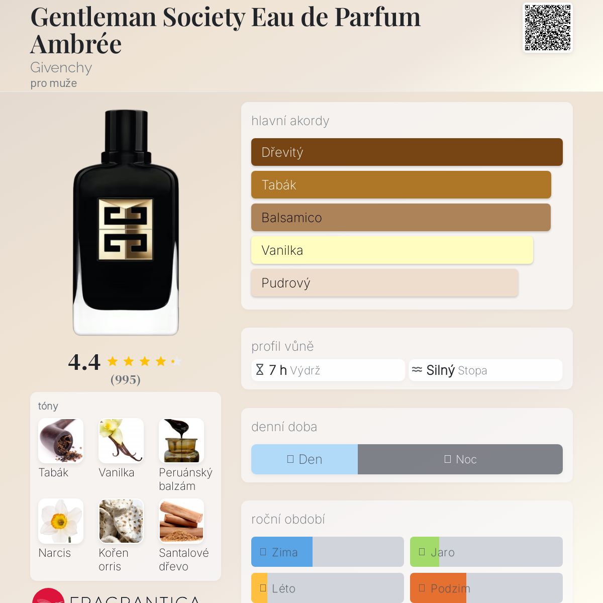 Gentleman Society Eau de Parfum Ambrée podle Givenchy je Orientální Woody vůně pro muže. Toto je nová vůně. Gentleman Society Eau de Parfum Ambrée byl/a uveden/a v roce 2025. Vrchní tóny jsou Muškátový oříšek, Šalvěj muškátová a Jalovcové bobulky; střední tóny jsouNarcis, Orris, Santalové dřevo, Madagaskarský vetiver a Haitský vetiver ; základní tóny jsou Tabák, Madagaskarská vanilka a Peruánský balzám.