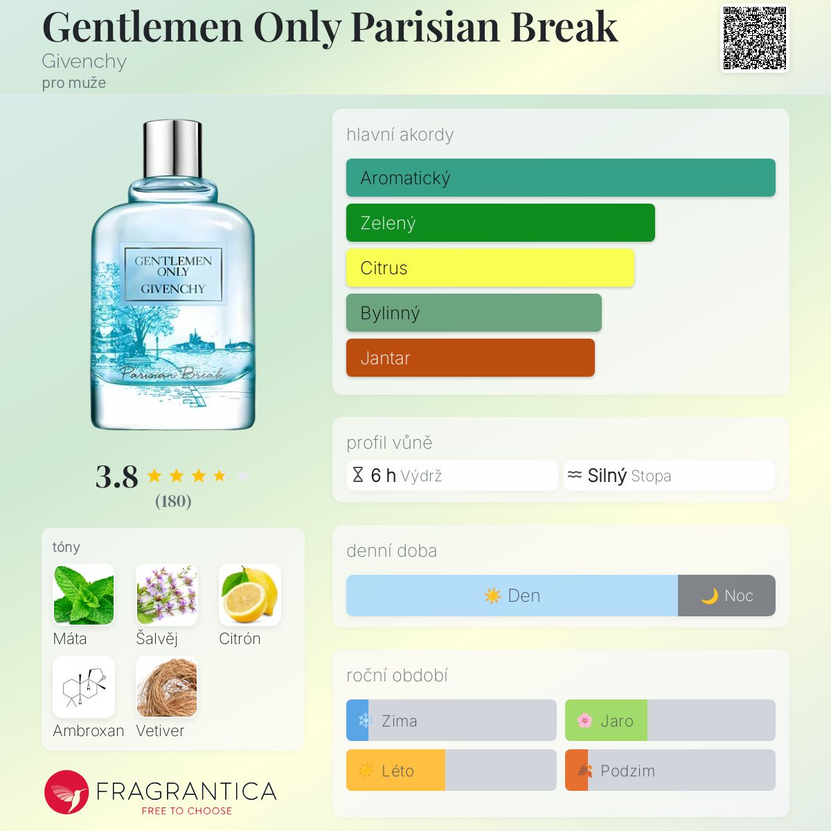 Gentlemen Only Parisian Break podle Givenchy je Citrus Aromatic vůně pro muže. Gentlemen Only Parisian Break byl/a uveden/a v roce 2016. Vrchní tóny jsou Máta a Citrón; střední tón jeŠalvěj ; základní tóny jsou Ambroxan a Haitský vetiver.