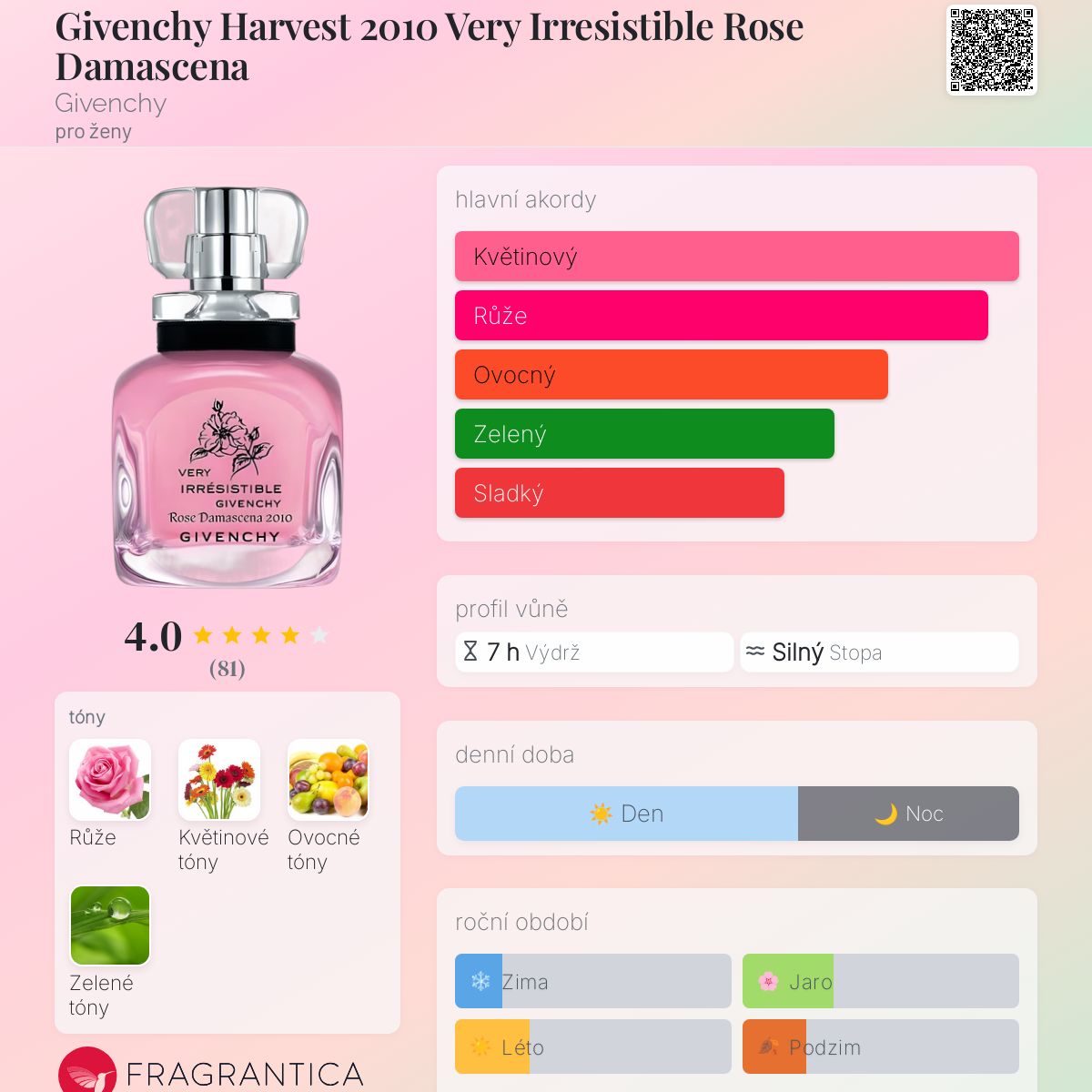 Givenchy Harvest 2010 Very Irresistible Rose Damascena podle Givenchy je Floral vůně pro ženy. Givenchy Harvest 2010 Very Irresistible Rose Damascena byl/a uveden/a v roce 2011. střední tóny jsouRůže, Květinové tóny, Ovocné tóny a Zelené tóny ;