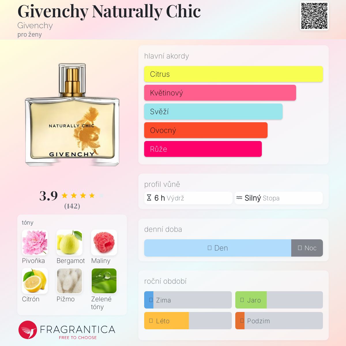 Givenchy Naturally Chic podle Givenchy je Floral Woody Musk vůně pro ženy. Givenchy Naturally Chic byl/a uveden/a v roce 2010. Vrchní tóny jsou Bergamot a Citron amalfi; střední tóny jsouPivoňka, Maliny a Zelené tóny ; základní tóny jsou Pižmo, Pačuli a Jantar (ambra).