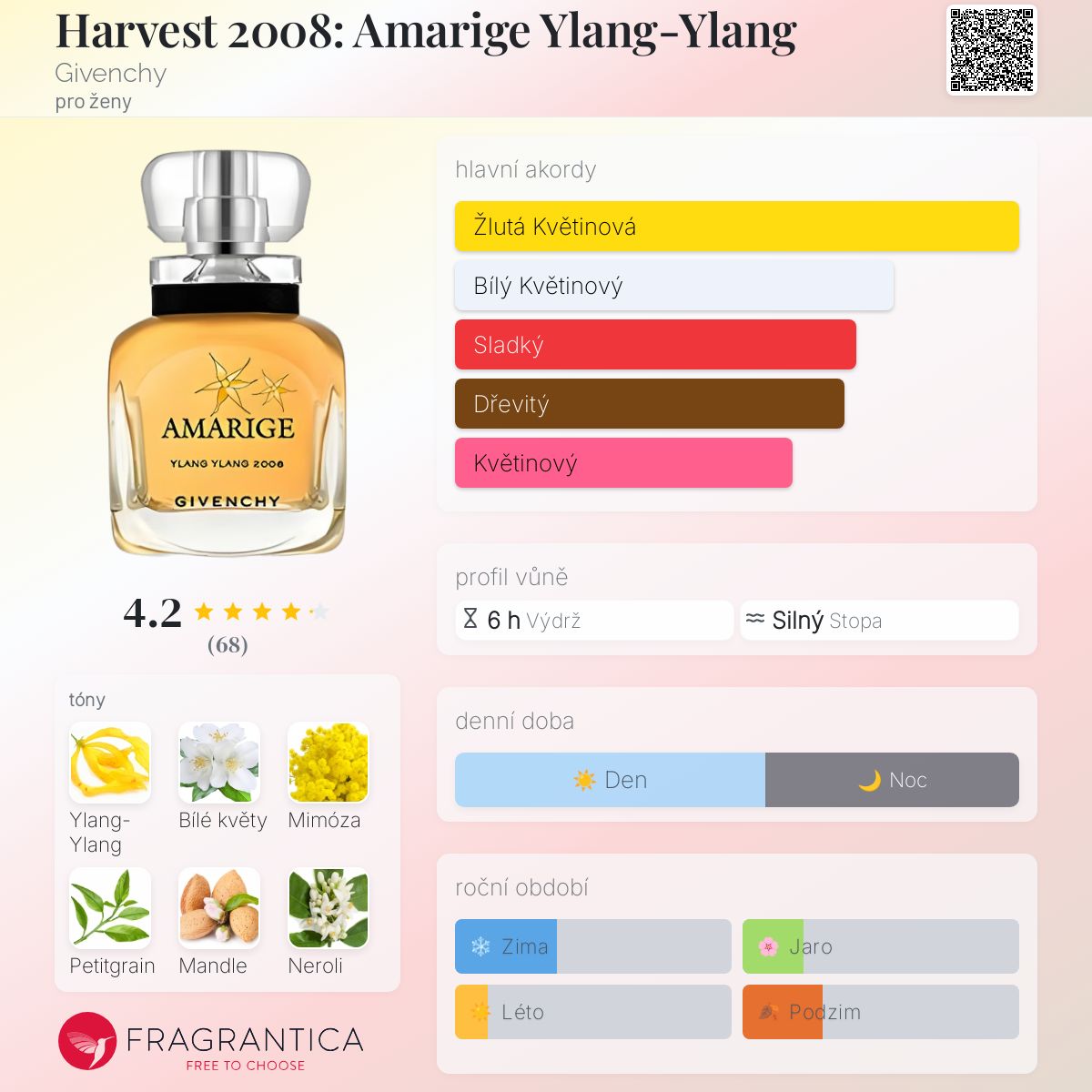 Harvest 2008: Amarige Ylang-Ylang podle Givenchy je Floral vůně pro ženy. Harvest 2008: Amarige Ylang-Ylang byl/a uveden/a v roce 2009. Vrchní tóny jsou Ylang-Ylang, Petitgrain, Mandle a Neroli; střední tóny jsouBílé květy a Mimóza ; základní tón je Dřevité tóny.