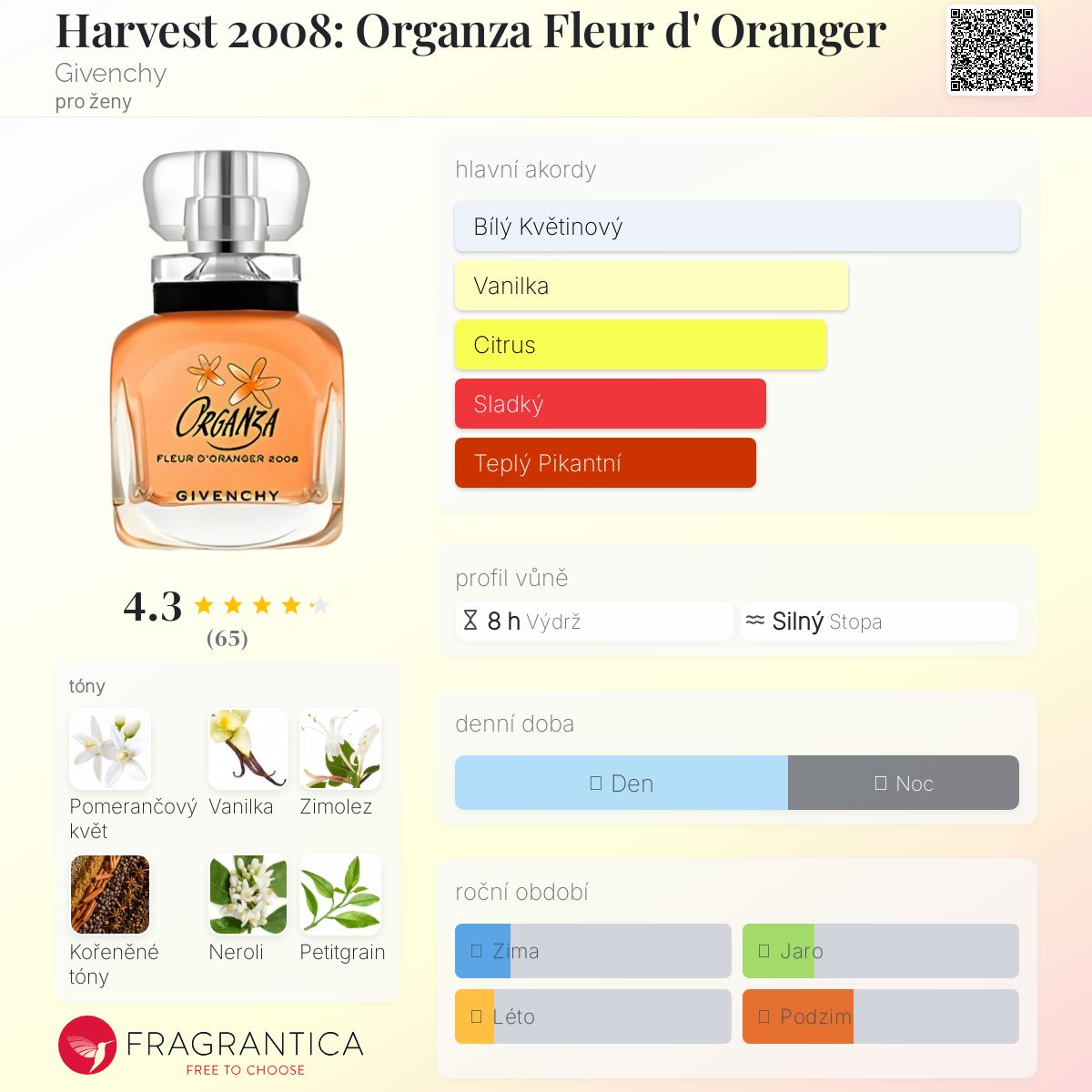 Harvest 2008: Organza Fleur d' Oranger podle Givenchy je Orientální Floral vůně pro ženy. Harvest 2008: Organza Fleur d' Oranger byl/a uveden/a v roce 2009. Vrchní tóny jsou Zimolez, Neroli a Petitgrain; střední tóny jsouKvět afrického pomeranče a Koření ; základní tón je Vanilka.