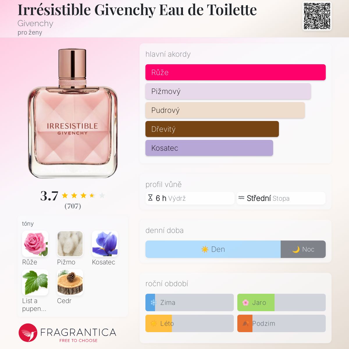 Irrésistible Givenchy Eau de Toilette podle Givenchy je Floral Fruity vůně pro ženy. Irrésistible Givenchy Eau de Toilette byl/a uveden/a v roce 2021. Irrésistible Givenchy Eau de Toilette byl/a vytvořen/a Fanny Bal, Dominique Ropion a Anne Flipo. Vrchní tóny jsou Růžová voda a Černý rybíz; střední tóny jsouDamašská růže a Kosatec ; základní tóny jsou Bílé pižmo a Virginský cedr.